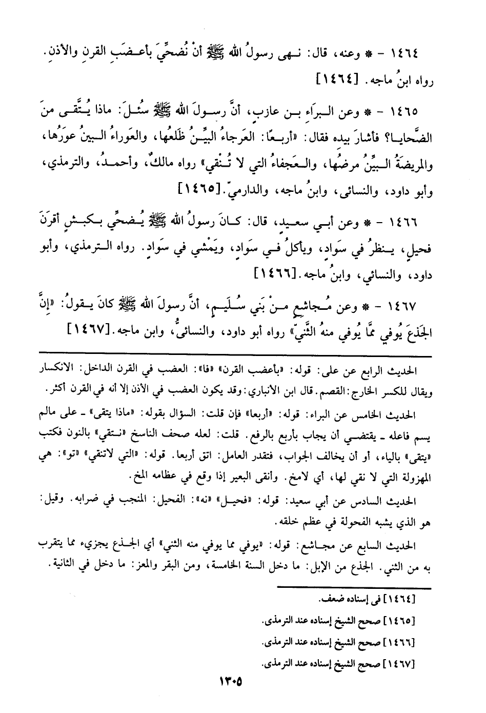 1466 - وعن أبي سعيد، قال: كان رسول الله صلى الله عليه وسلم يضحي بكبش أقرن فحيل، ينظر في سواد، ويأكل في سواد، ويمشي في سواد. رواه الترمذي، وأبو داود، والنسائي، وابن ماجه. [1466]