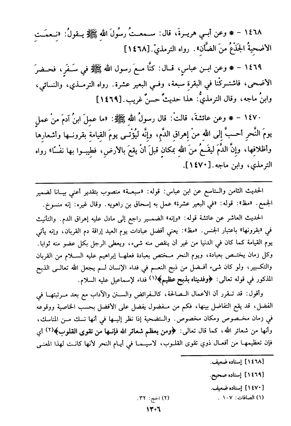 1470 - وعن عائشة، قالت: قال رسول الله صلى الله عليه وسلم: ((ما عمل ابن آدم من عمل يوم النحر أحب إلي الله من إهراق الدم، وإنه ليؤتى يوم القيامة بقرونها وأشعارها وأظلافها، وإن الدم ليقع من الله بمكان قبل أن يقع بالأرض، فطيبوا بها نفسًا)) رواه الترمذي، وابن ماجه. [1470]