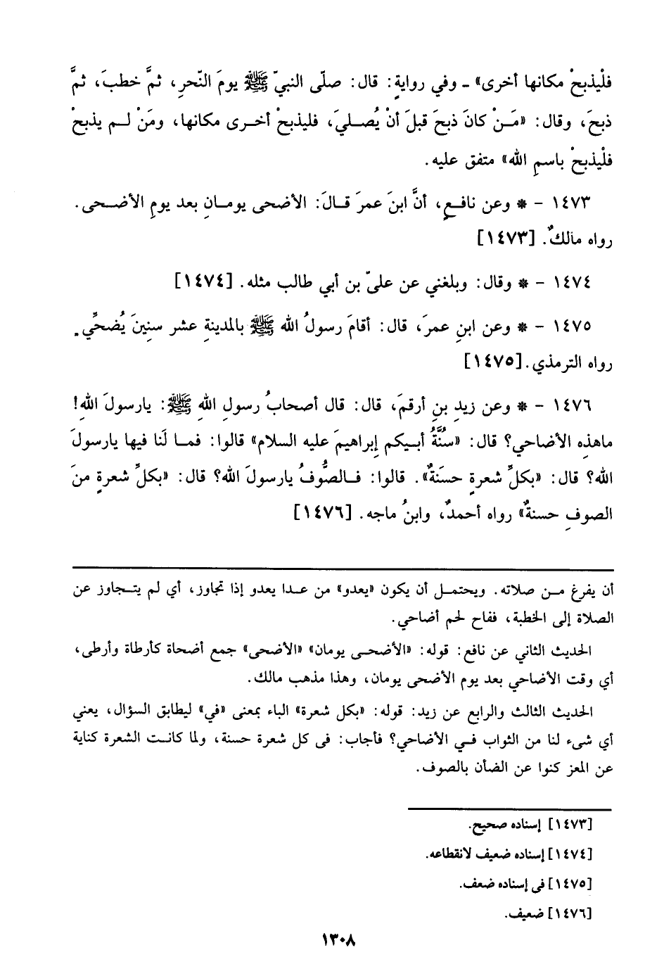 1476 - وعن زيد بن أرقم، قال: قال أصحاب رسول الله صلى الله عليه وسلم: يا رسول الله! ما هذه الأضاحي؟ قال: ((سنة أبيكم إبراهيم عليه السلام)) قالوا: فما لنا فيها يا رسول الله؟ قال: ((بكل شعرة حسنة)). قالوا: فالصوف يا رسول الله؟ قال: ((بكل شعرة من الصوف حسنة)) رواه أحمد، وابن ماجه. [1476]
