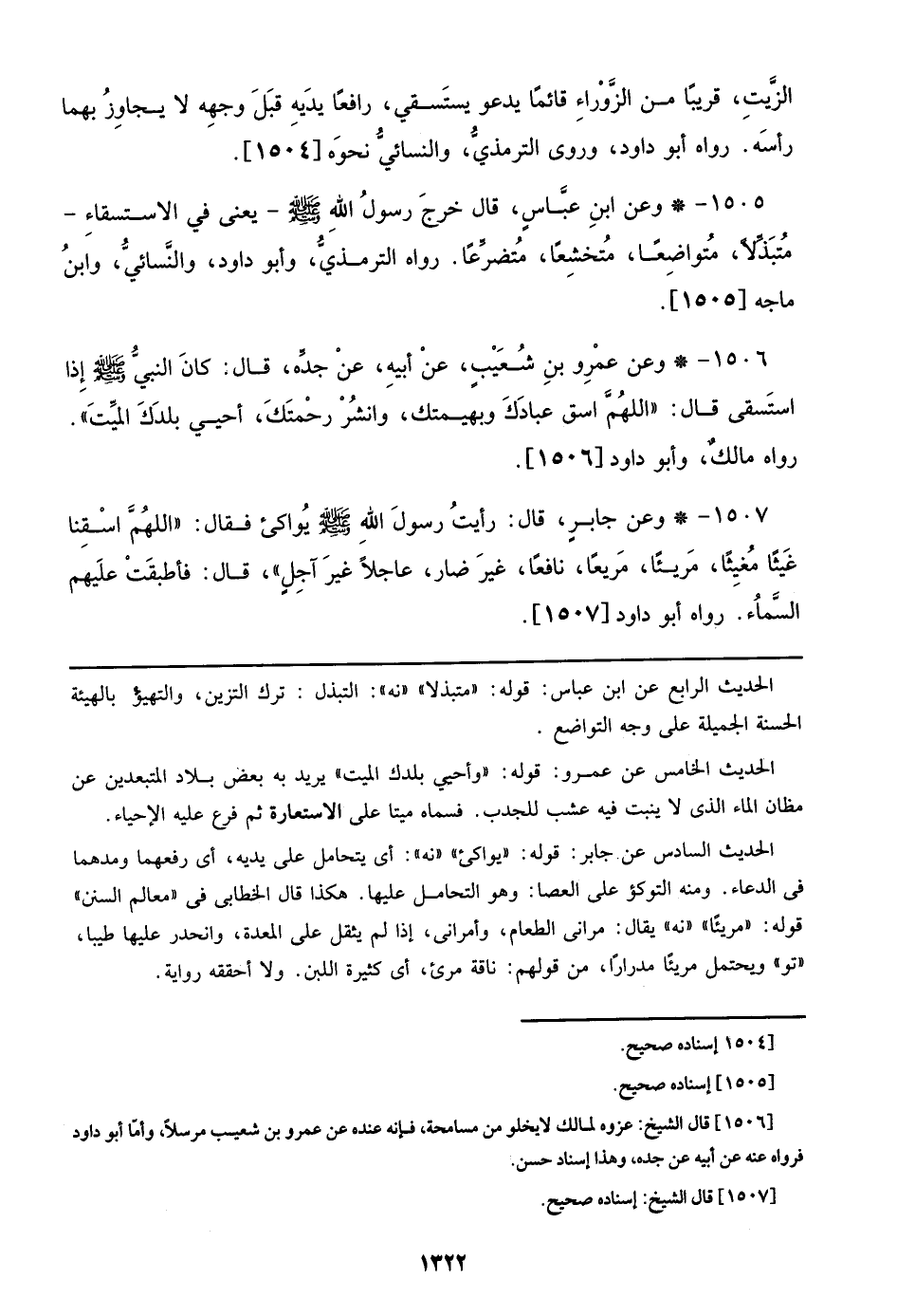 1506 - وعن عمرو بن شعيب، عن أبيه، عن جده، قال: كان النبي صلى الله عليه وسلم إذا استسقى قال: ((اللهم اسق عبادك وبهيمتك، وانشر رحمتك، أحيي بلدك الميت)). رواه مالك، وأبو داود. [1506]