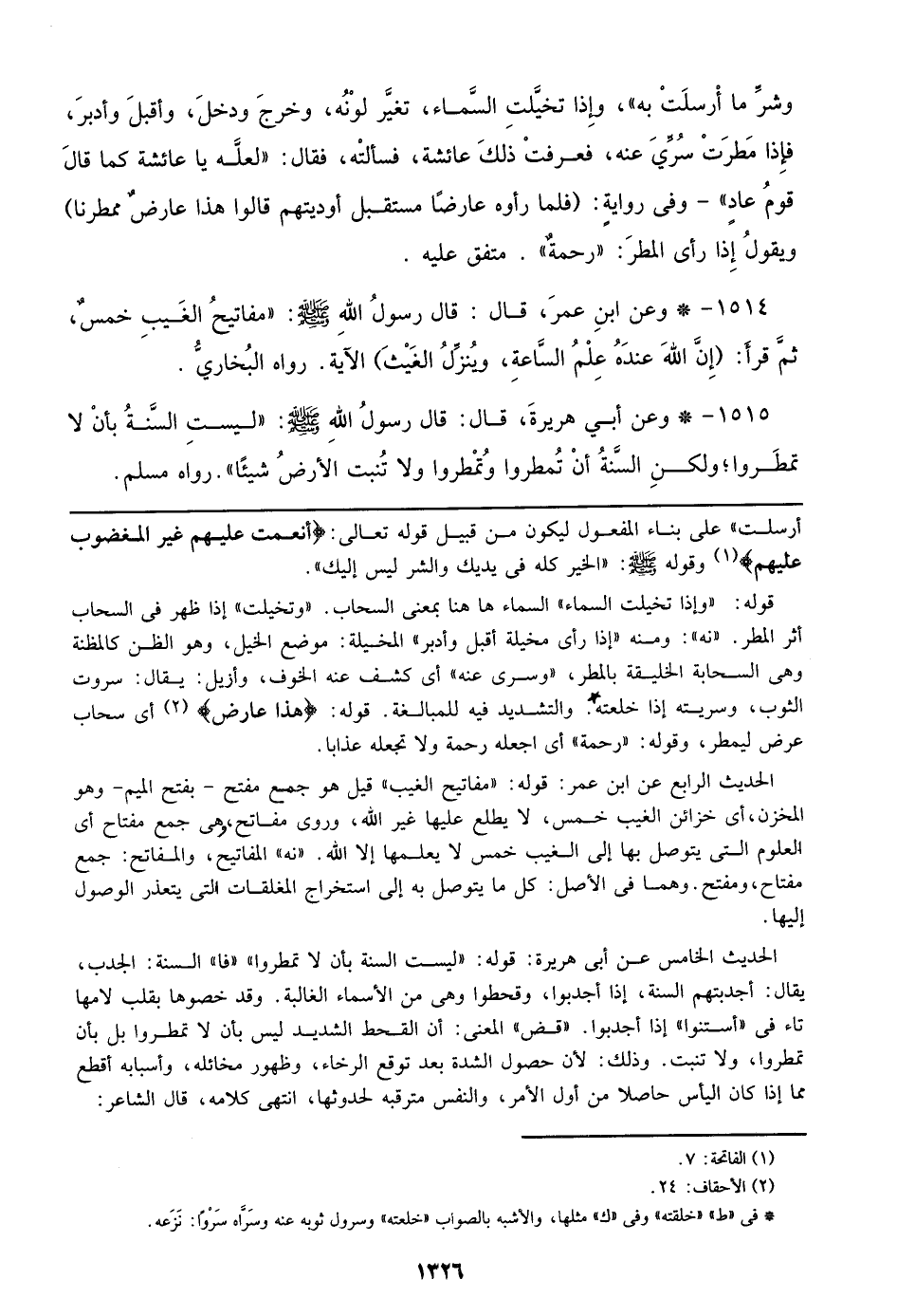 1514 - وعن ابن عمر، قال: قال رسول الله صلى الله عليه وسلم: ((مفاتيح الغيب خمس، ثم قرأ: {إن الله عنده علم الساعة، وينزل الغيث} الآية. رواه البخاري.