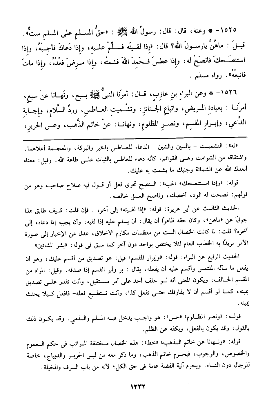 1526 - وعن البراء بن عازب، قال: أمرنا النبي صلى الله عليه وسلم بسبع، ونهانا عن سبع، أمرنا: بعيادة المريض، واتباع الجنائز، وتشميت العاطس، ورد السلام، وإجابة الداعي، وإبرار المقسم، ونصر المظلوم، ونهانا: عن خاتم الذهب، وعن الحرير،