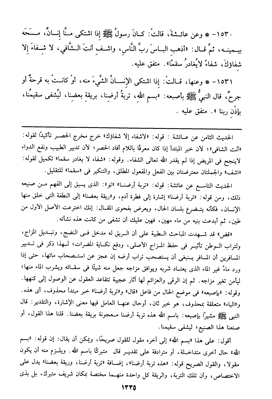 1531 - وعنها، قالت: إذا اشتكى الإنسان الشيء منه، أو كانت به قرحة أو جرح، قال النبي صلى الله عليه وسلم بأصبعه: ((بسم الله، تربة أرضنا، بريقة بعضنا، ليشفي سقيمنا، بإذن ربنا)). متفق عليه.