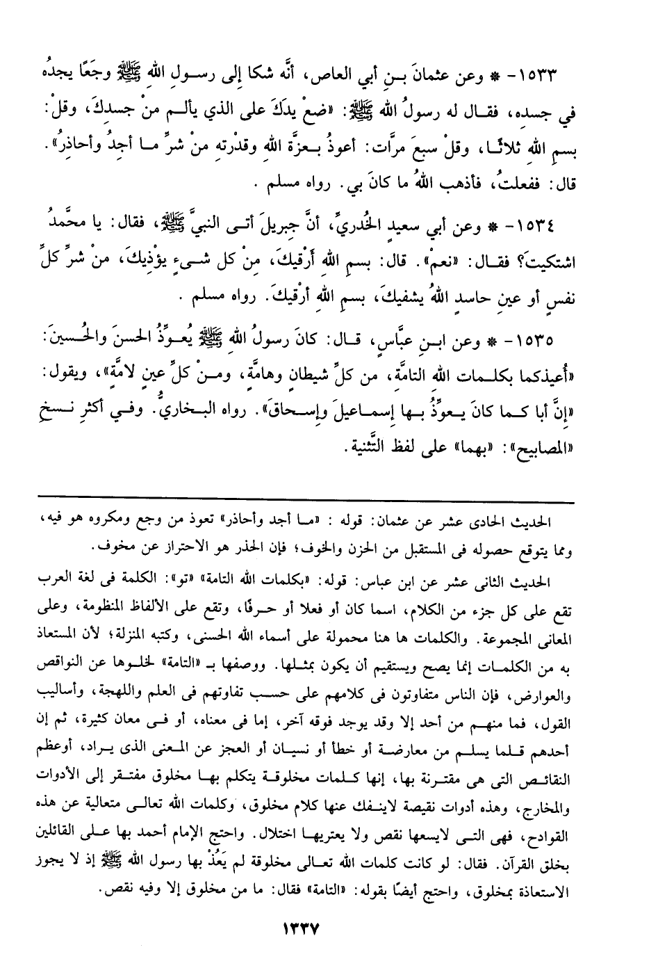1533 - وعن عثمان بن أبي العاص، أنه شكا إلي رسول الله صلى الله عليه وسلم وجعًا يجده في جسده، فقال له رسول الله صلى الله عليه وسلم: ((ضع يدك علي الذي يألم من جسدك، وقل: بسم الله ثلاثًا، وقل سبع مرات: أعوز بعزة الله وقدرته من شر ما أجد وأحاذر)). قال: ففعلت، فأذهب الله ما كان بي. رواه مسلم.