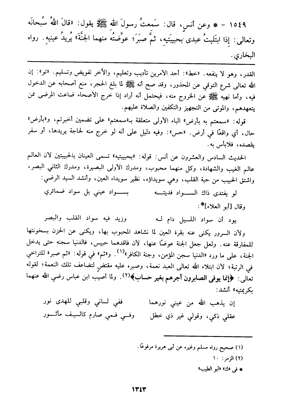 ولأن السرور يكنى عنه بقرة العين لما نشاهد المحبوب بها، ويكنى عن الحزن بسخونتها للمفارقة عنه. ولعل جعل الجنة عوضًا عنها، لأن فاقدهما حبيس، فالدنيا سجنه حتى يدخل الجنة، علي ما ورد ((الدنيا سجن المؤمن، وجنة الكافر)). و ((ثم)) في قوله: ((ثم صبر)) للتراخي في الرتبة؛ لأن ابتلاء الله تعالي العبد نعمة، وصبره عليه مقتضٍ لتضاعف تلك النعمة؛ لقوله تعالي: {إنما يوفي الصابرون أجرهم بغير حساب}. ولما أصيب ابن عباس رضي الله عنهما بكريمتيه)) أنشد: