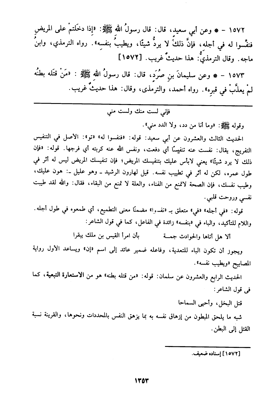 1572 - وعن أبي سعيد، قال: قال رسول الله صلى الله عليه وسلم: ((إذا دخلتم علي المريض فنفسوا له في أجله، فإن ذلك لا يرد شيئًا، ويطيب نفسه)). رواه الترمذي، وابن ماجه. وقال الترمذي: هذا حديث غريب. [1572]
