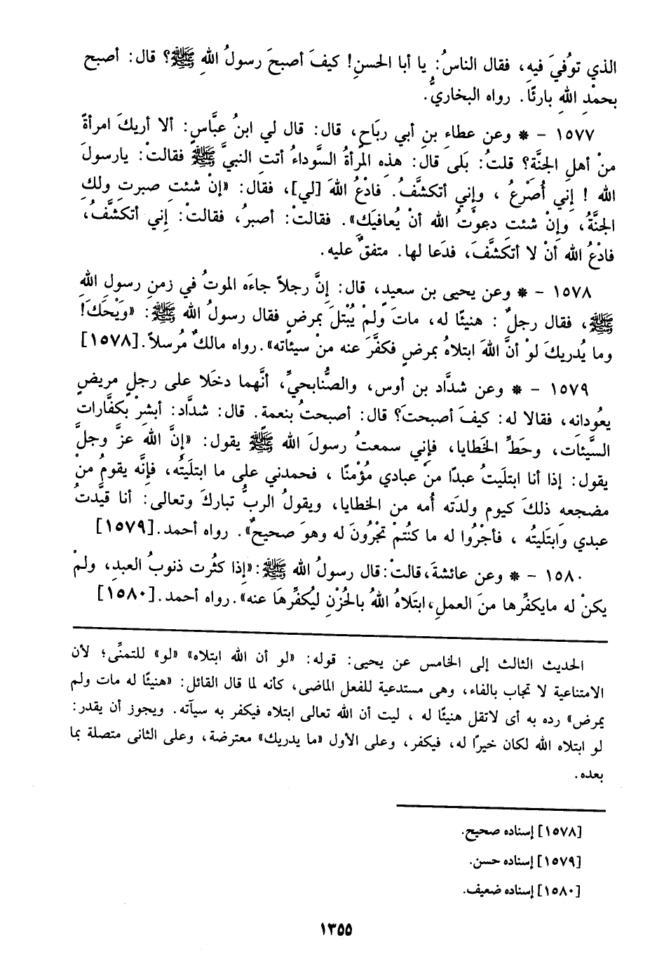 1579 - وعن شداد بن أوس، والصنابحي، أنهما دخلا علي رجل مريض يعودانه، فقالا له: كيف أصبحت؟ قال: أصبحت بنعمة. قال: شداد: أبشر بكفارات السيئات، وحط الخطايا، فإني سمعت رسول الله صلى الله عليه وسلم يقول: ((إن الله عز وجل يقول: إذا أنا ابتليت عبدًا من عبادي مؤمنًا، فحمدني علي ما ابتليته، فإنه يقوم من مضجعه ذلك كيوم ولدته أمه من الخطايا، ويقول الرب تبارك وتعالي: أنا قيدت عبدي وابتليته، فأجروا له ما كنتم تجرون له وهو صحيح)). رواه أحمد. [1579]