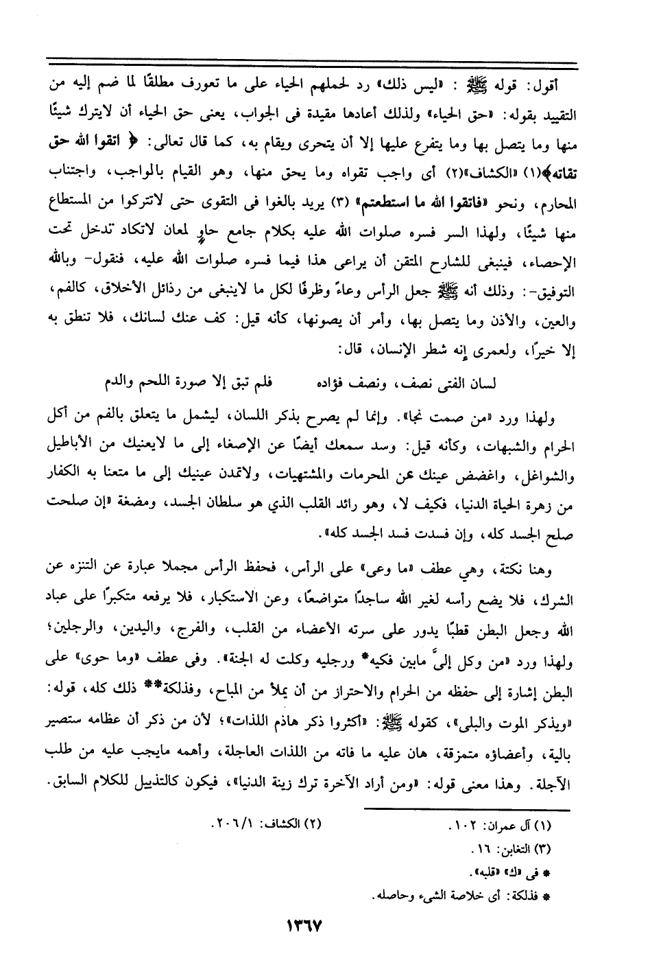 أقول: قوله صلى الله عليه وسلم: ((ليس ذلك)) رد لحملهم الحياء علي ما تعورف مطلقاً لما ضم إليه من التقييد بقوله: ((حق الحياء)) ولذلك أعادها مقيدة في الجواب، يعني حق الحياء أن يترك شيئاً منها وما يتصل بها وما يتفرع عليها إلا أن يتحرى ويقام به، كما قال تعالي: {اتقوا الله حق تقاته} ((الكشاف)) أي واجب تقواه وما يحق منها، وهو القيام بالواجب، واجتناب المحارم، ونحو ((فاتقوا الله ما استطعتم)) يريد بالغوا في التقوى حتى لا تتركوا من المستطاع منها شيئاَ، ولهذا السر فسره صلوات الله عليه بكلام جامع حاو لمعان لا تكاد تدخل تحت الإحصاء، فينبغي للشارح المتقن أن يراعي هذا فيما فسره صلوات الله عليه، فنقول- وبالله التوفيق-: وذلك أنه صلى الله عليه وسلم جعل الرأس وعاء وظرفاً لكل ما لا ينبغي من رذائل الأخلاق، كالفم والعين، والأذن وما يتصل بها، وأمر أن يصونها، كأنه قيل: كف عنك لسانك، فلا تنطق به إلا خيراً، ولعمري إنه شطر الإنسان، قال: