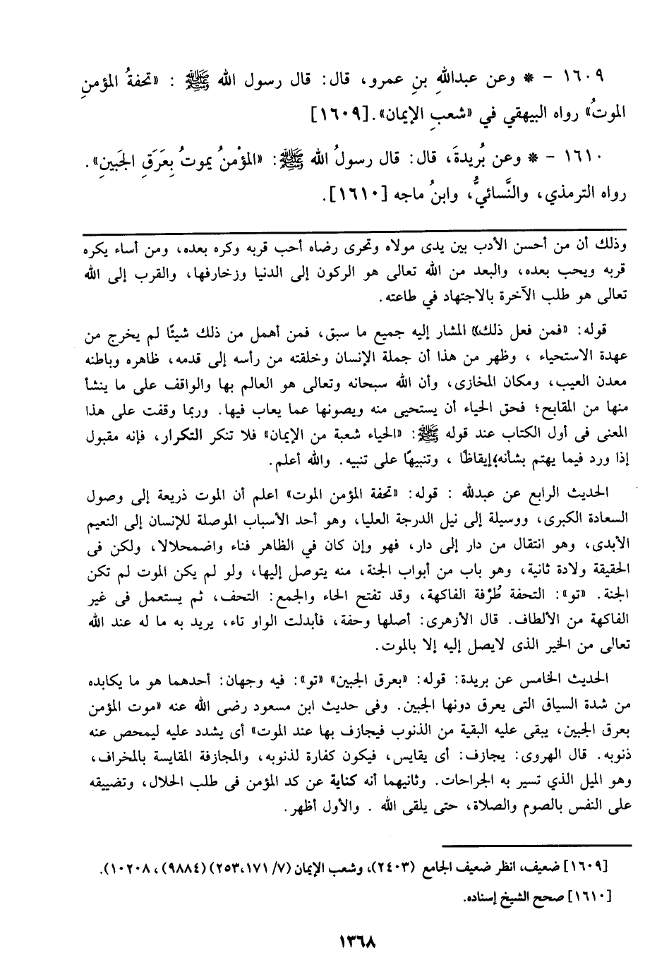 1609 - وعن عبد الله بن عمرو، قال: قال رسول الله صلى الله عليه وسلم: ((تحفة المؤمن الموت)) رواه البيهقي في ((شعب الإيمان)). [1609]