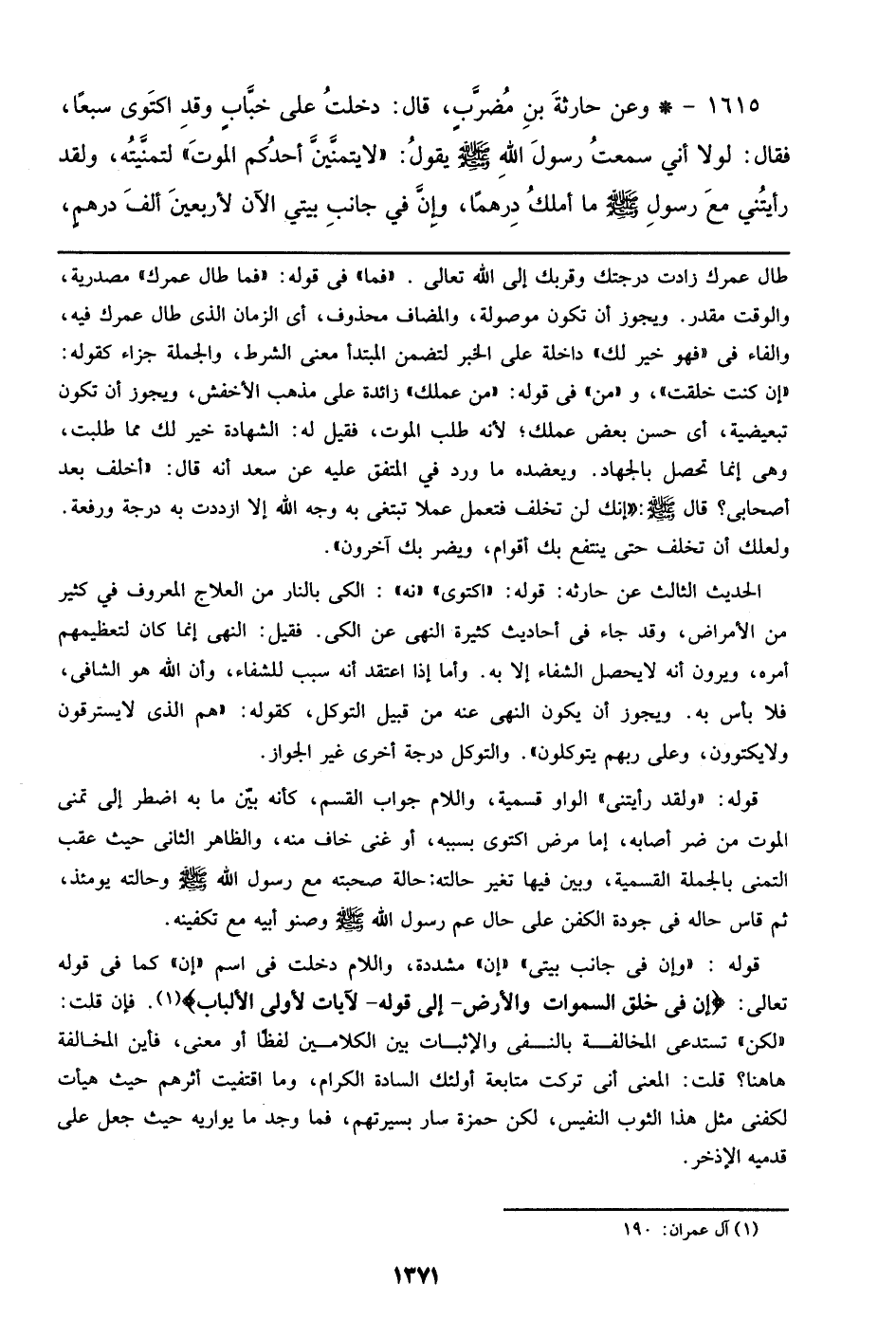 1615 - وعن حارثة بن مضرب، قال: دخلت علي خباب وقد اكتوى سبعاً، فقال: لولا إني سمعت رسول الله صلى الله عليه وسلم يقول: ((لا يتمنين أحدكم الموت)) لتمنيته، ولقد رأيتني مع رسول الله صلى الله عليه وسلم ما أملك درهماً، وإن في جانب بيتي الآن لأربعين ألف درهم،