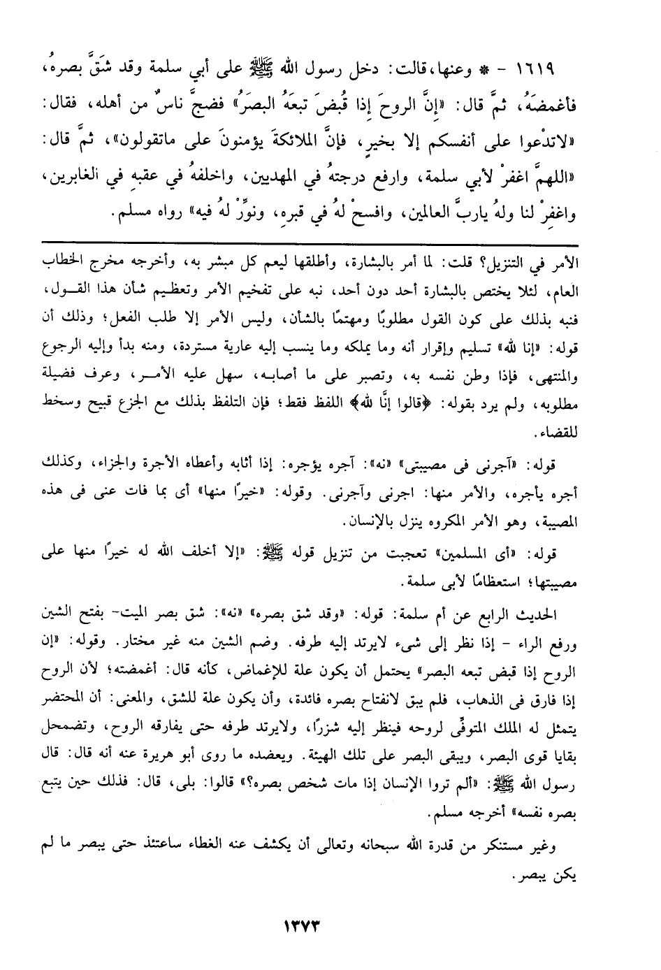 1619 - وعنها، قالت: دخل رسول الله صلى الله عليه وسلم علي أبي سلمة وقد شق بصره، فأغمضه، ثم قال: ((إن الروح إذا قبض تبعه البصر)) فضج ناس من أهله، فقال: ((لا تدعوا علي أنفسكم إلا بخير، فإن الملائكة يؤمنون علي ما تقولون))، ثم قال: ((اللهم اغفر لأبي سلمة، وارفع درجته في المهديين، واخلفه في عقبه في الغابرين، واغفر لنا وله يا رب العالمين، وأفسح له في قبره، ونور له فيه)) رواه مسلم.