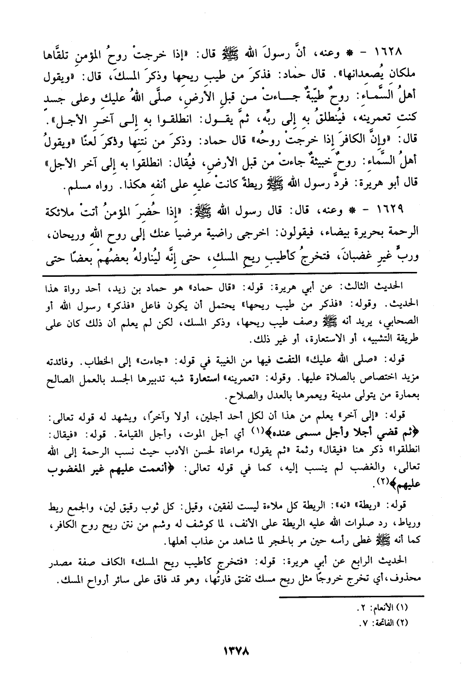 1628 - وعنه، أن رسول الله صلى الله عليه وسلم قال: ((إذا خرجت روح المؤمن تلقاها ملكان يصعدانها)). قال حماد: فذكر من طيب ريحها وذكر المسك، قال: ((ويقول أهل السماء: روح طيبة جاءت من أرض طيبة، صلي الله عليك وعلي جسد كنت تعمرينه، فينطلق به إلي ربه، ثم يقول: انطلقوا به إلي آخر الأجل)). قال: ((وإن الكافر إذا خرجت روحه)) قال حماد: وذكر من نتنها وذكر لعا ((ويقول أهل السماء: روح خبيثة جاءت من قبل الأرض، فيقال: انطلقوا به إلي آخر الأجل)) قال أبو هريرة: فرد رسول الله صلى الله عليه وسلم ريطة كانت عليه علي أنفه هكذا. رواه مسلم.