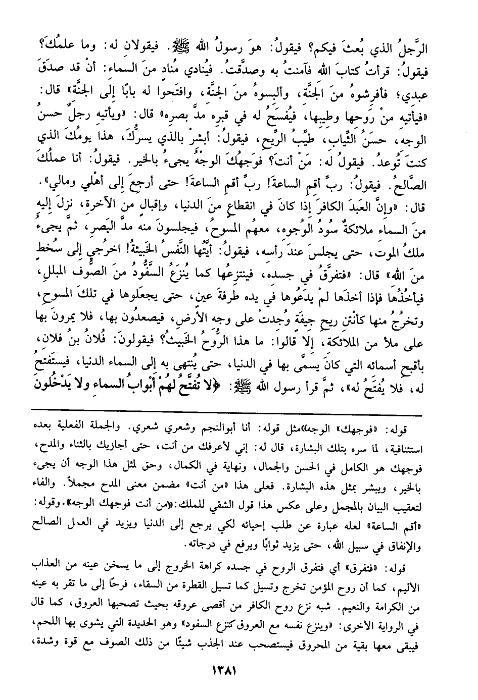 قوله: ((فوجهك)) الوجه)) مثل قوله: أنا أبو النجم وشعري شعري. والجملة الفعلية بعده استئنافية، لما سره بتلك البشارة، قال له: إني لأعرفك من أنت، حتى أجازيك بالثناء والمدح، فوجهك هو الكامل في الحسن والجمال، ونهاية في الكمال، وحق لمثل هذا الوجه أن يجيء بالخير، ويبشر بمثل هذه البشارة. فعلي هذا ((من أنت)) مضمن معنى المدح مجملاً. والفاء لتعقيب البيان بالمجمل وعلي عكس هذا قول الشقي للملك: ((من أنت فوجهك الوجه)). وقوله: ((أقم الساعة)) لعله عبارة عن طلب إحيائه لكي يرجع إلي الدنيا ويزيد في العمل الصالح والإنفاق في سبيل الله، حتى يزيد ثواباً ويرفع درجاته.