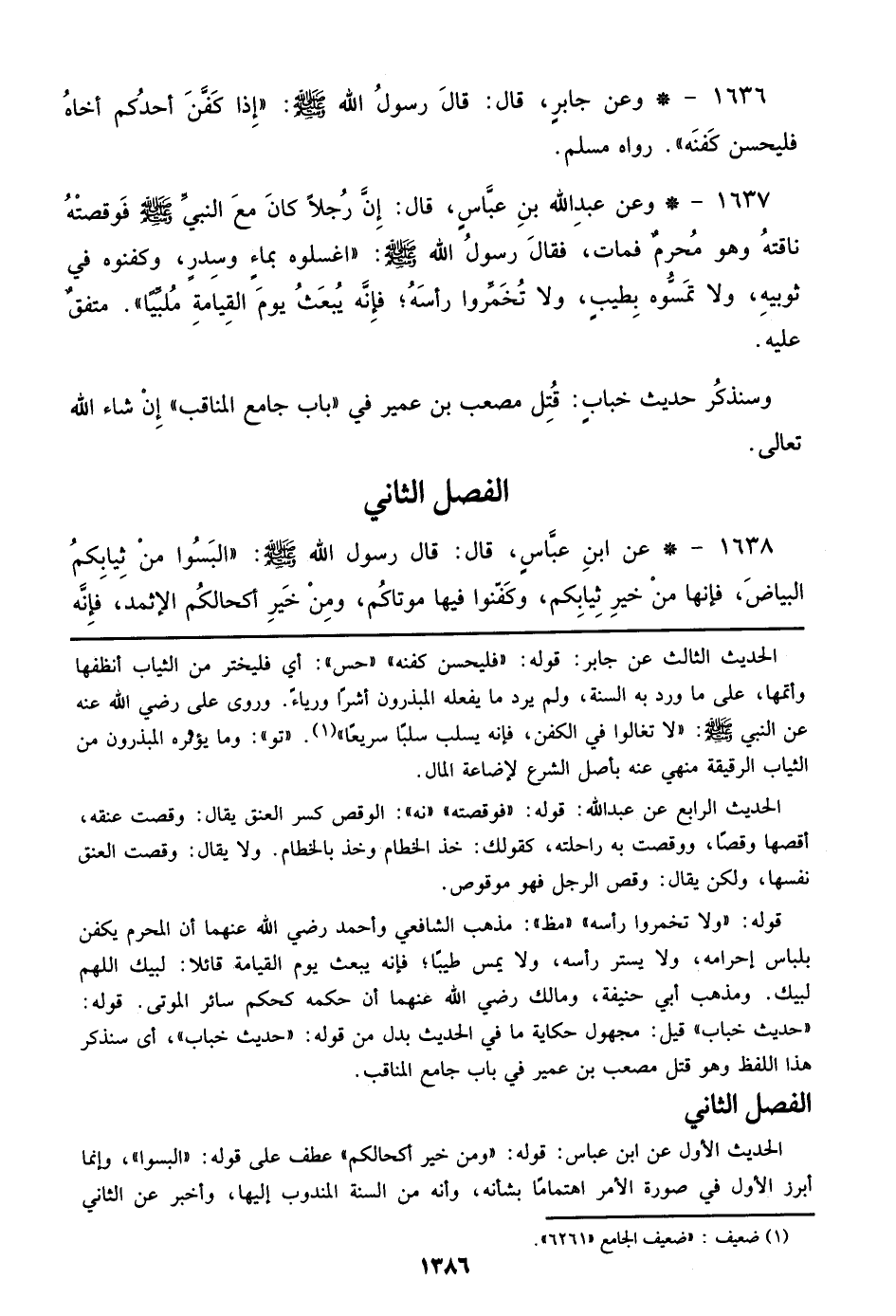 1637 - وعن عبد الله بن عباس، قال: إن رجلاً كان مع النبي صلى الله عليه وسلم فوقصته ناقته وهو محرم فمات، فقال رسول الله صلى الله عليه وسلم: ((اغسلوه بماء وسدر، وكفنوه في ثوبيه، ولا تمسوه بطيب، ولا خمروا رأسه؛ فإنه يبعث يوم القيامة ملبيا)). متفق عليه.