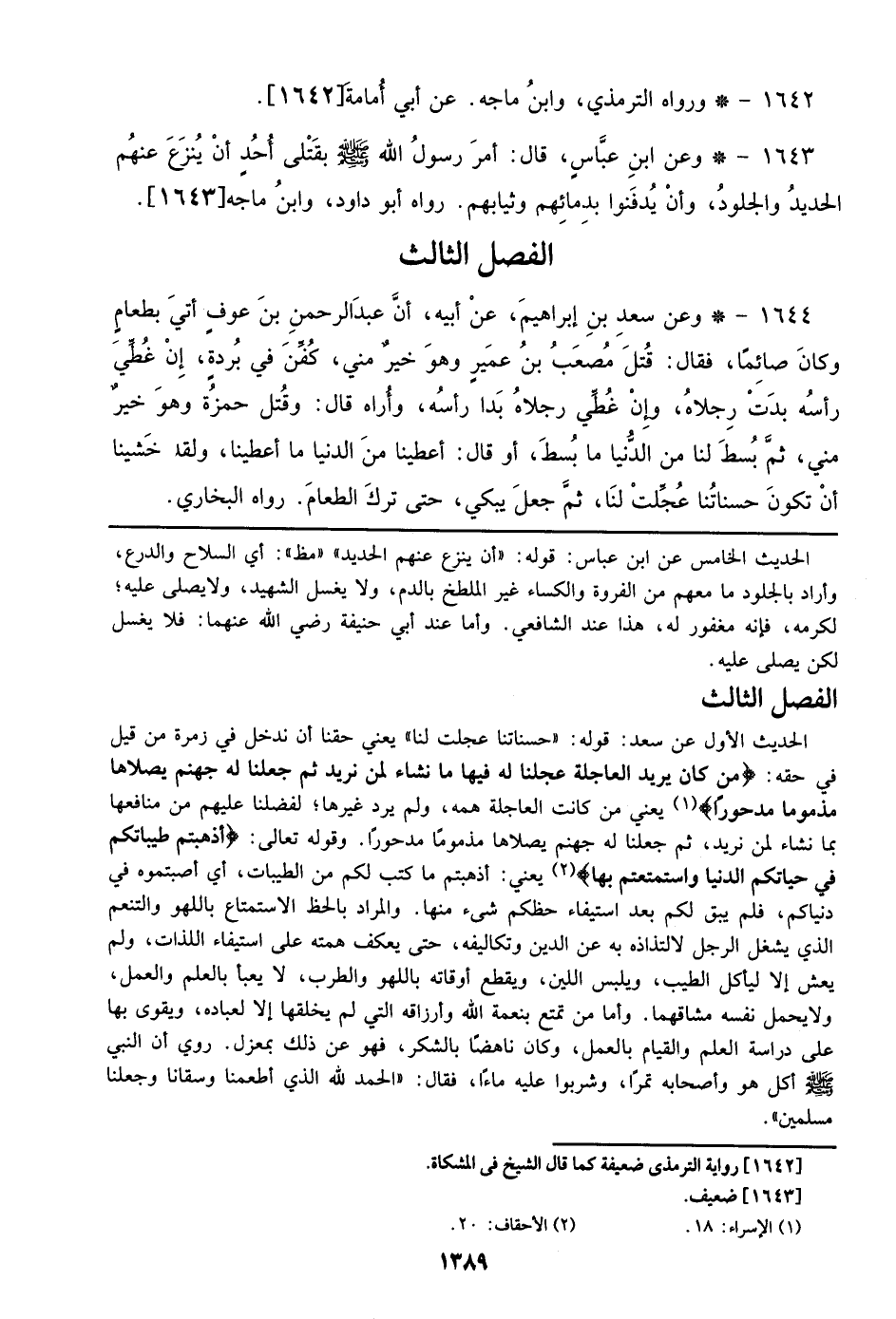 الحديث الأول عن سعد: قوله: ((حسناتنا عجلت لنا)) يعني حقنا أن ندخل في زمرة من قيل في حقه: {من كان يريد العاجلة عجلنا له فيها ما شاء لمن نريد ثم جعلنا له جهنم يصلاها مذموماً مدحورا} يعني من كان العاجلة همه، ولم يرد غيرها؛ لفضلنا عليهم من منافعنا بما نشاء لمن نريد، ثم جعلنا له جهنم يصلاها مذموماً مدحوراً. وقوله تعالي: {أذهبتم طيباتكم في حياتكم الدنيا واستمتعتم بها} يعني: أذهبتم ما كتب لكم من الطيبات، أي أصبتموه في دنياكم، فلم يبق لكم بعد استيفاء حظكم شيء منها. والمراد بالحظ الاستمتاع باللهو والتنعم الذي يشغل الرجل لالتذاذه به عن الدين وتكاليفه، حتى يعكف همته علي استيفاء اللذات، ولم يعش إلا ليأكل الطيب، ويلبس اللين، ويقطع أوقاته باللهو والطرب، ولا يعبأ بالعلم والعمل، ولا يحمل نفسه مشاقما. وأما من تمتع بنعمة الله وأرزاقه التي لم يخلقها إلا لعباده، ويقوى بها علي دراسة العلم والقيام بالعمل، وكان ناهضاً بالشكر، فهو عن ذلك بمعزل. روي أن النبي صلى الله عليه وسلم أكل هو وأصحابه تمراً، وشربوا عليه ماءاً، فقال: ((الحمد لله الذي أطعمنا وسقانا وجعلنا مسلمين)).