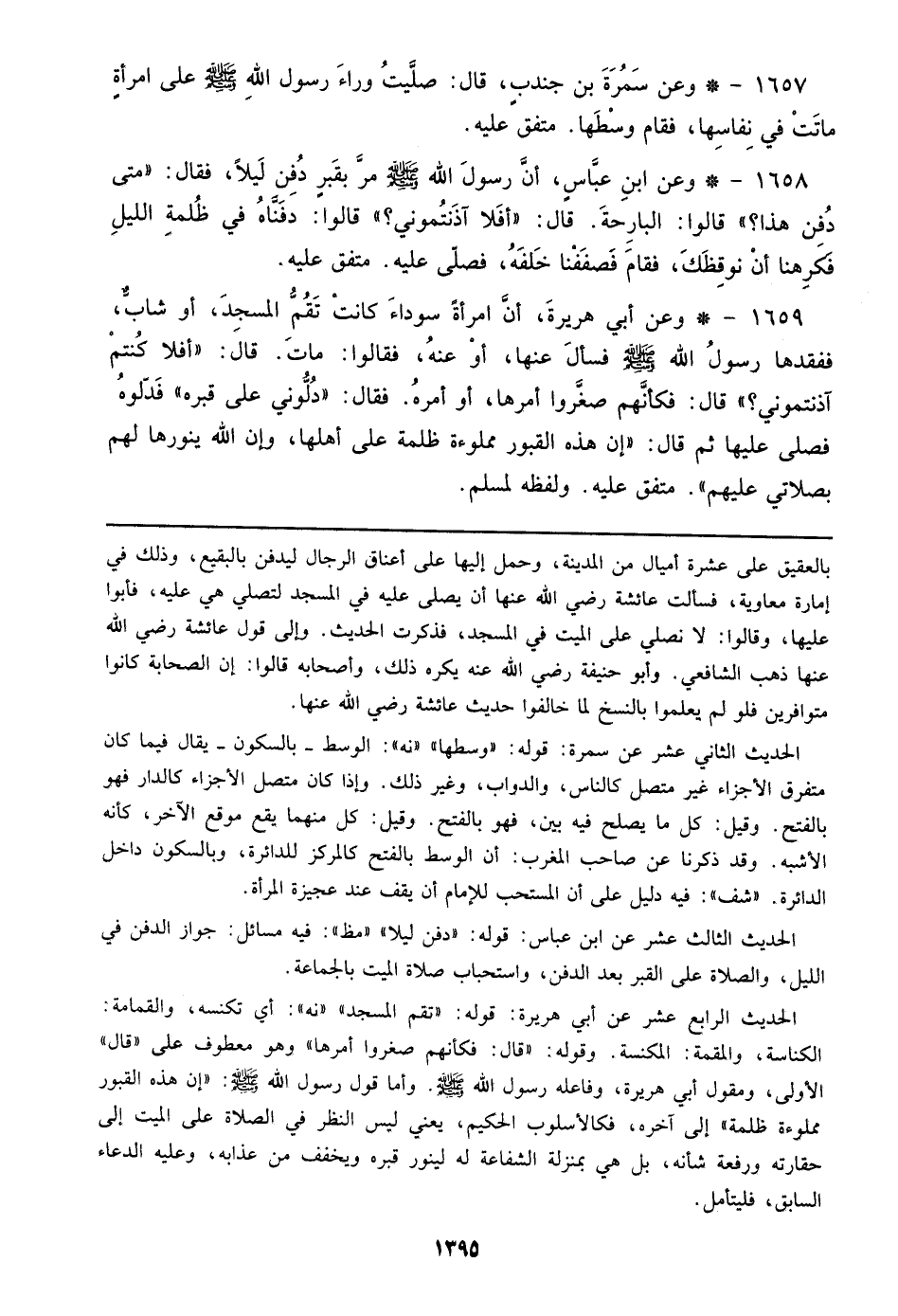 1657 - وعن سمرة بن جندب، قال: صليت وراء رسول الله صلى الله عليه وسلم علي امرأة ماتت في نفسها، فقام وسطها. متفق عليه.