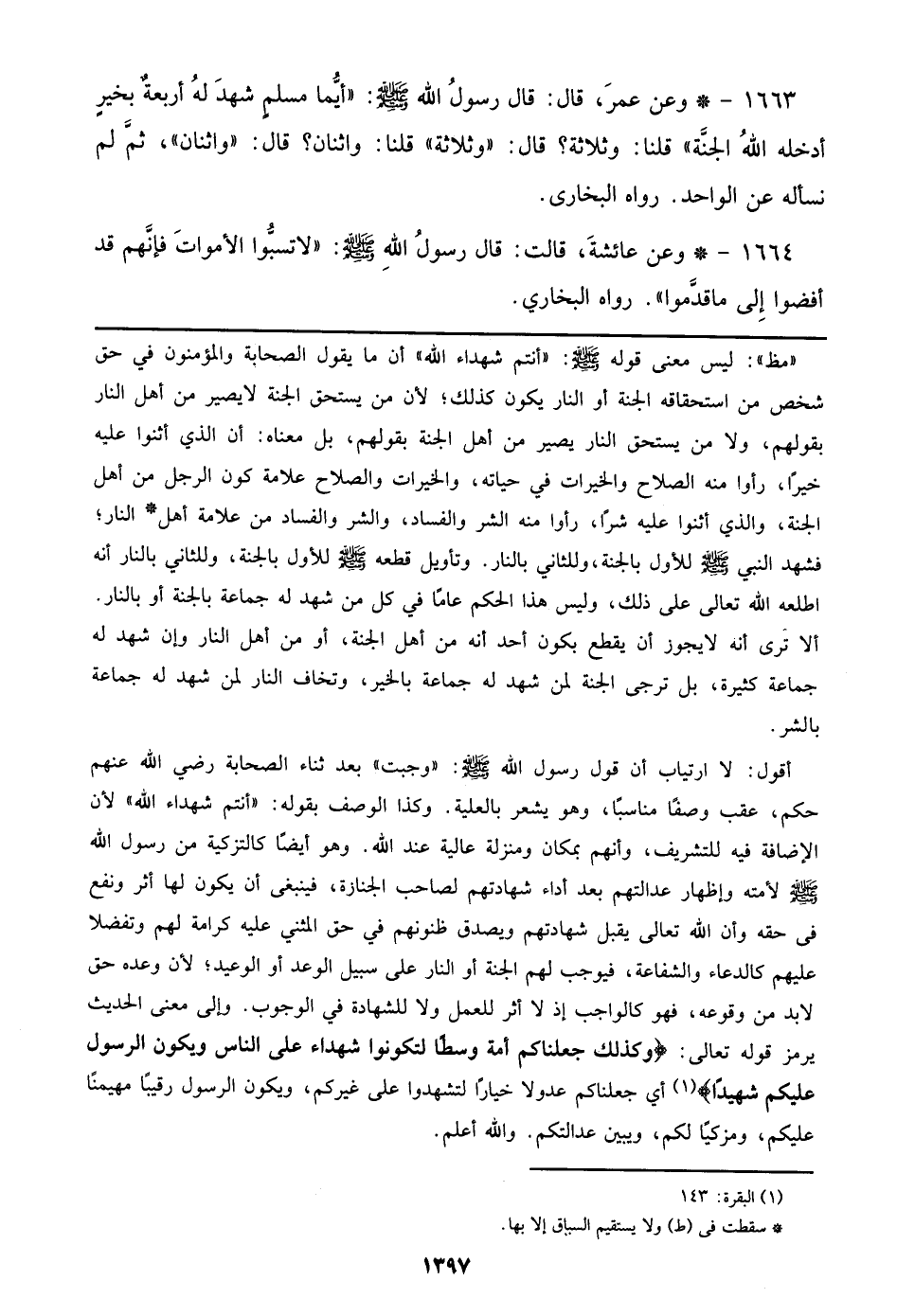 1663 - وعن عمر، قال: قال رسول الله صلى الله عليه وسلم: ((أيما مسلم شهد له أربعة بخير أدخله الله الجنة)) قلنا: وثلاثة؟ قال: ((وثلاثة)) قلنا: واثنان؟ قال: ((واثنان))، ثم لم نسأله عن الواحد. رواه البخاري.