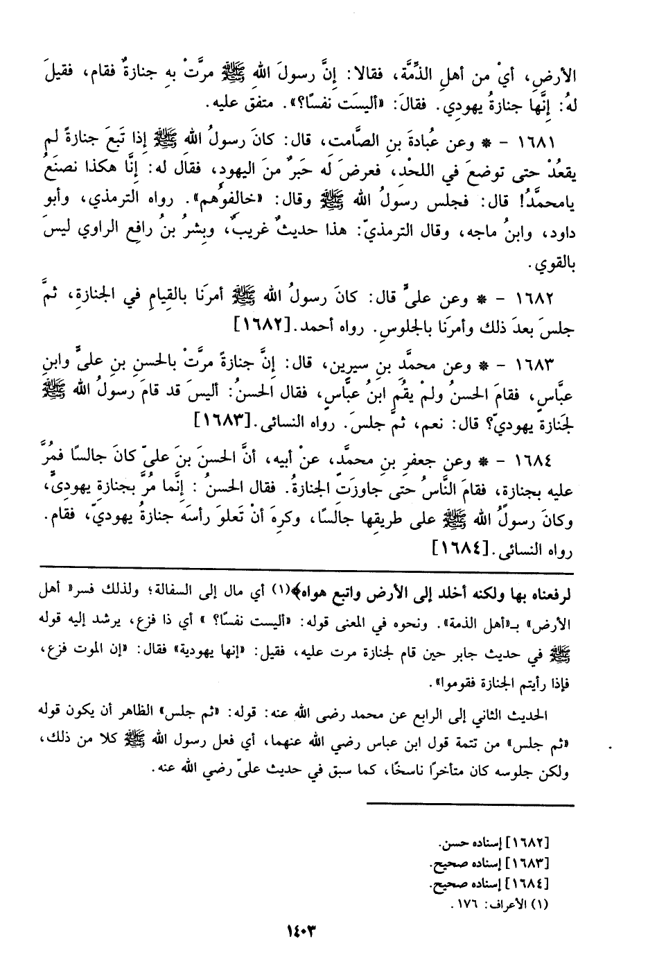 1684 - وعن جعفر بن محمد، عن أبيه، أن الحسن بن علي كان جالساً فمر عليه بجنازة، فقام الناس حتى جاوزت الجنازة. فقال الحسن: إنما مر بجنازة يهودى، وكان رسول الله صلى الله عليه وسلم علي طريقها جالساً، وكره أن تعلو رأسه جنازة يهودي، فقام رواه النسائى. [1684]