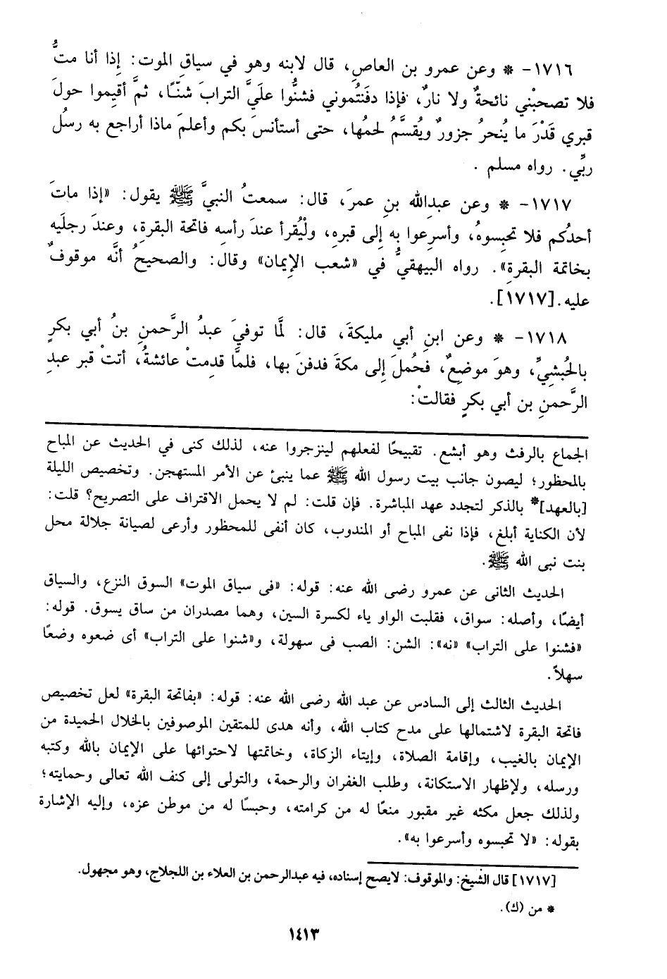 1716 - وعن عمرو بن العاص، قال لابنه وهو في سياق الموت: إذا أنا مت فلا تصحبني نائحة ولا نار، فإذا دفنتموني فشنوا علي التراب شناً، ثم أقيموا حول قبري قدر ما ينحر جزور ويقسم لحمها، حتى أستانس بكم وأعلم ماذا أراجع به رسل ربي. رواه مسلم.