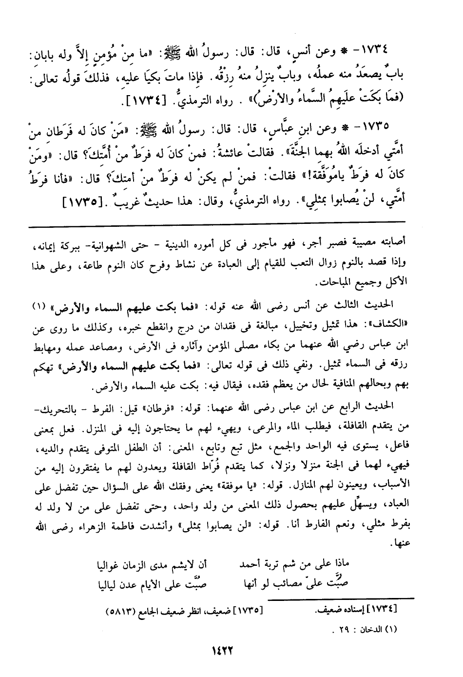 1734 - وعن أنس، قال: قال: رسول الله صلى الله عليه وسلم: ((ما مِنْ مُؤمنٍ إِلاَّ وله بابان: بابٌ يصعَدُ منه عملُه، وبابٌ ينزلُ منه رِزقُه. فإِذا ماتَ بكيَا عليهِ، فذلكَ تولُه تعالي: {فما بكتْ عليهمُ السماء والأرضُ})). رواه الترمذيُّ. [1734]