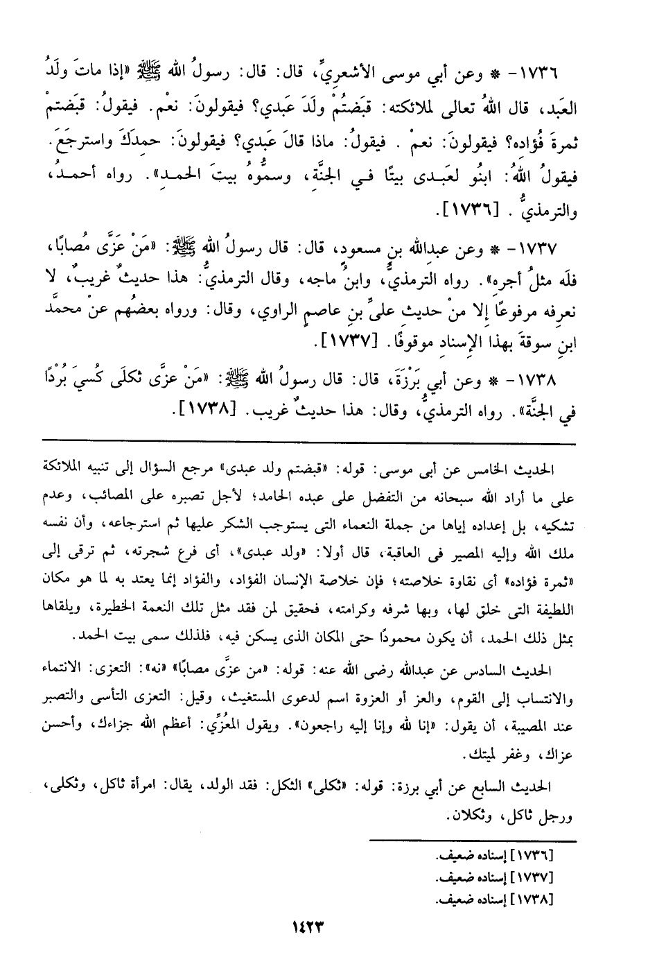 1736 - وعن أبي موسى الأشعريِّ، قال: قال: رسول الله صلى الله عليه وسلم ((إذا مات ولدُ العبد، قال الله تعالي لملائكته: قبضتم ولدَ عبدي؟ فيقولونَ: نعم. فيقولُ: قبضتم ثمرةَ فُؤاده؟ فيقولون: نعم. فيقولُ: ماذا قال عبدي؟ فيقولون: حمدك واسترجع. فيقول الله: ابنو لعبدي بيتًا في الجنة، وسموه بيت الحمد)). رواه أحمدُ، والترمذيُّ. [1736]