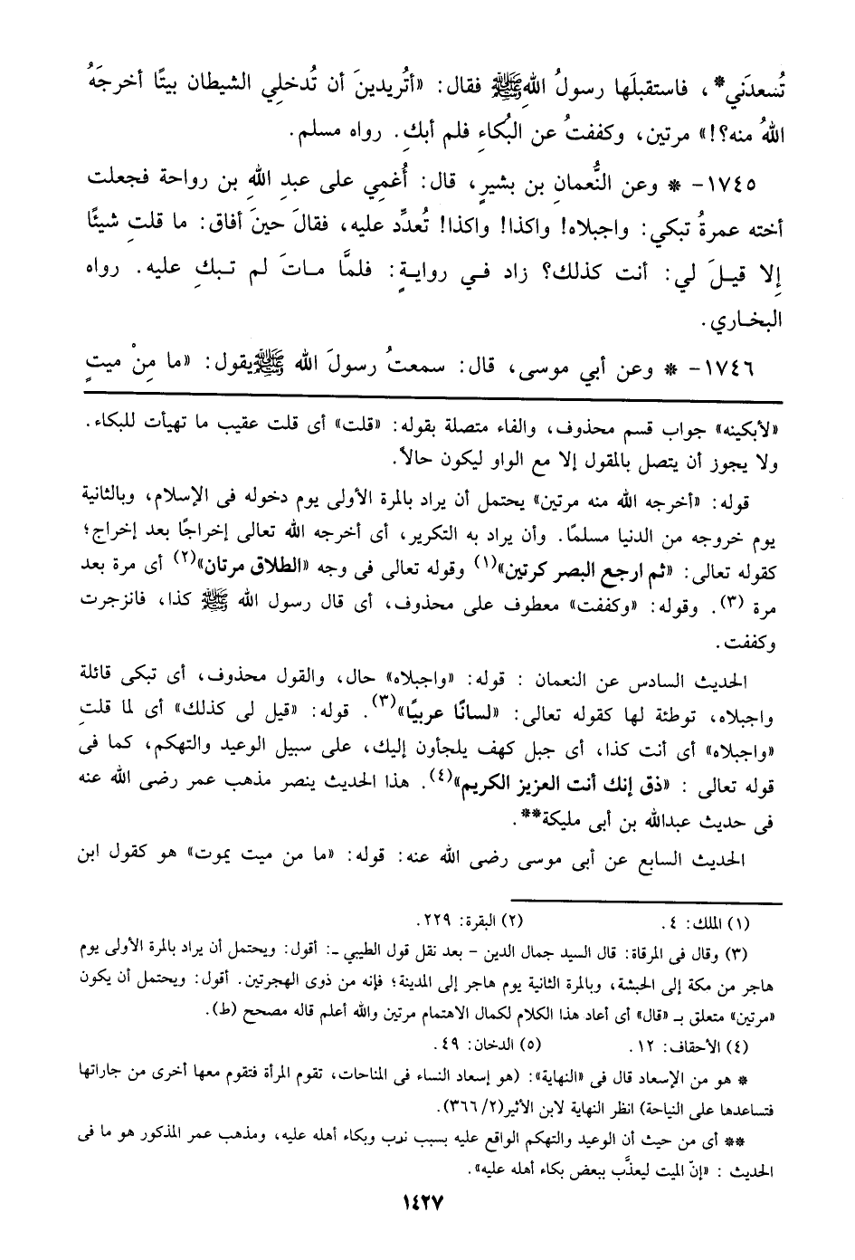 تُسعدَني*، فاستقبلها رسولُ الله صلى الله عليه وسلم فقال: ((أتريدينَ أن تُدخلي الشيطان بيتًا أخرجَهُ الله منه؟!)) مرتين، وكففت عن البكاء فلم أبكِ. رواه مسلم.