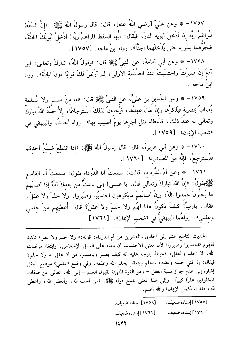 1757 - وعن عليّ [رضي الله عنه]، قال: قال رسول الله صلى الله عليه وسلم: ((إنَّ السقط ليُراغمُ ربه إذا أدخل أبويه النار، فيقال: أيها السقط المراغم ربه! أدخل أبويك الجنة، فيجرهما بسرره حتى يدخلهما الجنة)). رواه ابن ماجه. [1757].