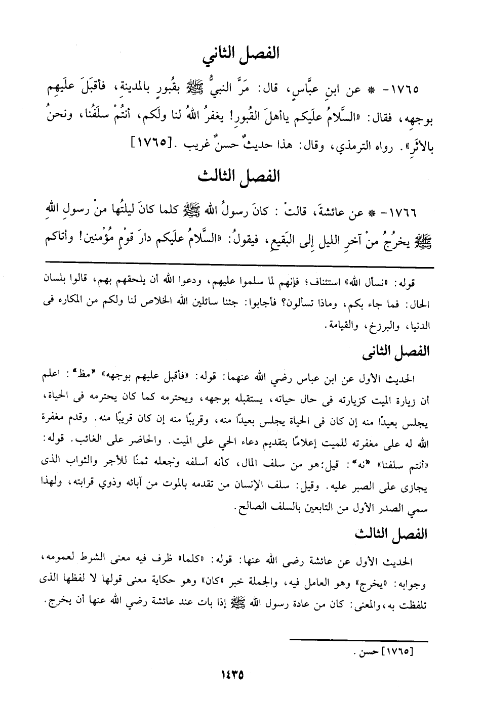 1765 - عن ابن عبَّاسٍ، قال: مرَّ النبيُّ صلى الله عليه وسلم بقُبور بالمدينة، فأقبلَ عليهم بوجهه، فقال: ((السلامُ عليكم يا أهل القبورِ! يغفرُ اللهُ لنا ولكم، أنتم سلفنا، ونحنُ بالأثرِ)). رواه الترمذي، وقال: هذا حديثٌ حسنٌ غريب. [1765]