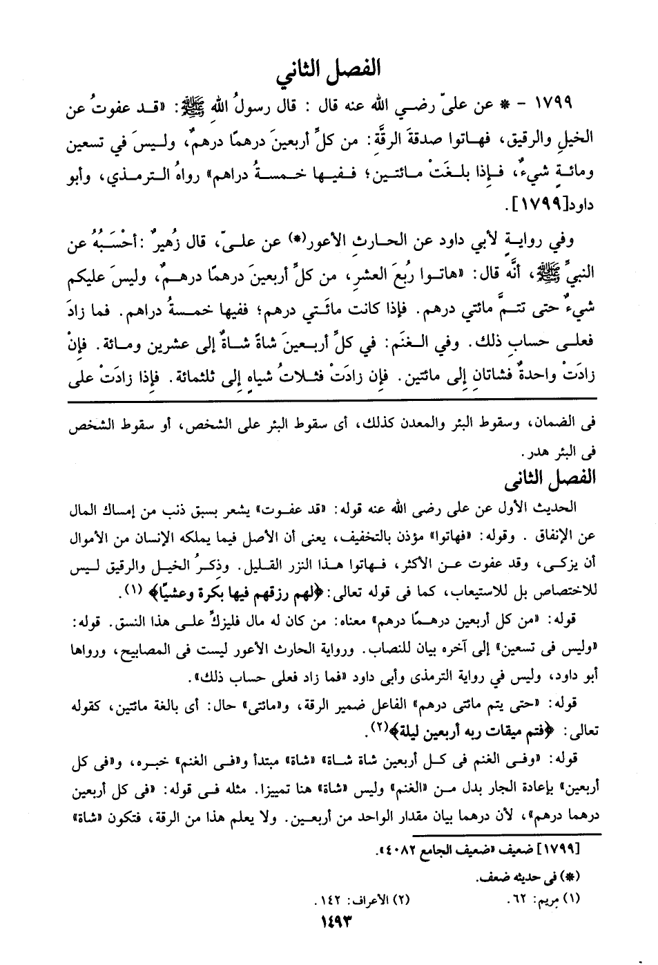 1799 - عن عليّ رضي الله عنه قال: قال رسولُ اللهِ صلى الله عليه وسلم: ((قد عفوتُ عن الخيلِ والرقيق، فهاتوا صدقةَ الرقَّةِ: من كلِّ أربعينَ درهماً درهمٌ، وليسَ في تسعين ومائة شيءٌ، فإِذا بلغَتْ مائتين؛ ففيها خمسةُ دراهم)) رواهُ الترمذي، وأبو داود [1799].