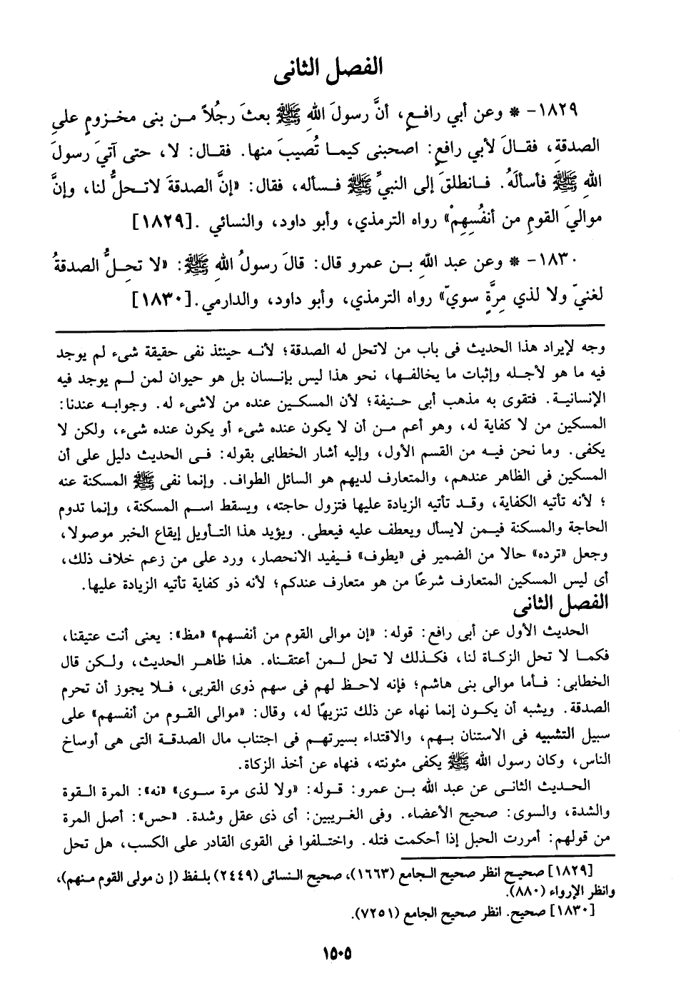 1829 - وعن أبي رافعٍ، أنَّ رسولَ الله صلى الله عليه وسلم بعثَ رجُلاً من بنى مخزومٍ علي الصدقةِ، فقال لأبي رافعٍ: اصحبنى كيما تُصيبَ منها. فقال: لا، حتى آتيَ رسول الله صلى الله عليه وسلم فأسأَلَهُ. فانطلق إلي النبيِّ صلى الله عليه وسلم فسأله، فقال: ((إنَّ الصدقةَ لاتحلُّ لنا، وإنَّ مواليَ القومِ من أنفُسهِمِ)) رواه الترمذي، وأبو داود، والنسائي. [1829]