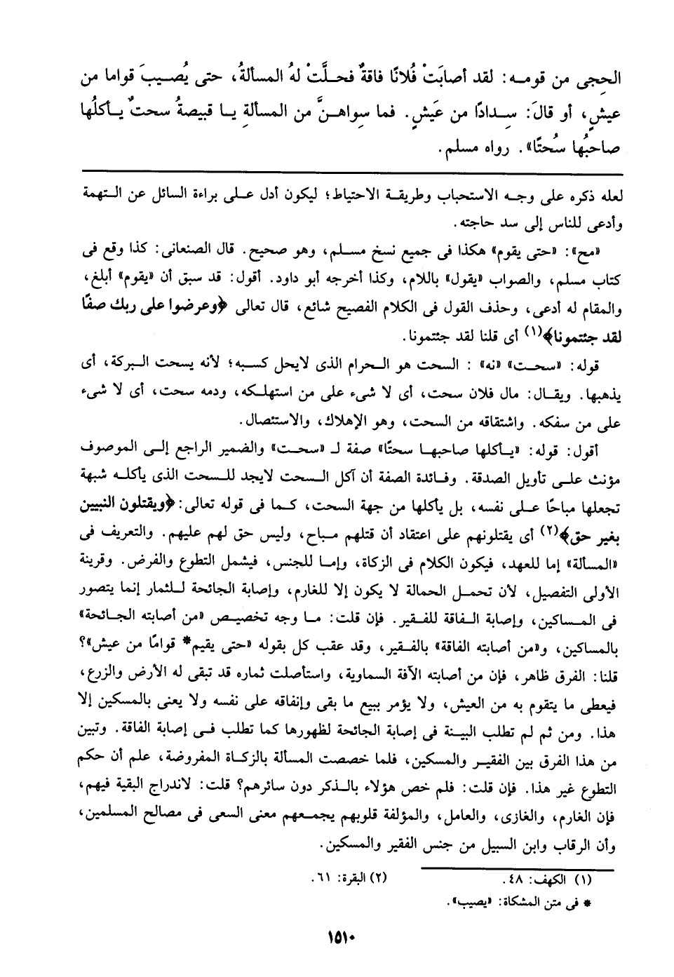 أقول: قوله: ((يأكلها صاحبها سحتًا)) صفة لـ ((سحت)) والضمير الراجع إلي الموصوف مؤنث علي تأويل الصدقة. وفائدة الصفة أن أكل السحت لايجد للسحت الذي يأكله شبهة تجعلها مباحًا علي نفسه، بل يأكلها من جهة السحت، كما في قوله تعالي: {ويقتلون النبيين بغير حق} أي يقتلونهم علي اعتقاد أن قتلهم مباح، وليس حق لهم عليهم. والتعريف في ((المسألة)) إما للعهد، فيكون الكلام في الزكاة، وإما للجنس، فيشمل التطوع والفرض. وقرينة الأولي التفصيل، لأن تحمل الحمالة لا يكون إلا للغارم، وإصابة الجائحة للثمار إنما يتصور في المساكين، وإصابة الفاقة للفقير. فإن قلت: ما وجه تخصيص ((من أصابته الجائحة)) بالمساكين، و ((من أصابته الفاقة)) بالفقير، وقد عقب كل بقوله ((حتى يقيم* قوامًا من عيش))؟ قلنا: الفرق ظاهر، فإن من أصابته الآفة السماوية، واستأصلت ثماره قد تبقى له الأرض والزرع، فيعطى ما يتقوم به من العيش، ولا يؤمر ببيع ما بقى وإنفاقه علي نفسه ولا يعنى بالمسكين إلا هذا. ومن ثم لم تطلب البينة في إصابة الجائحة لظهورها كما تطلب في إصابة الفاقة. وتبين من هذا الفرق بين الفقير والمسكين، فلما خصصت المسألة بالزكاة المفروضة، علم أن حكم التطوع غير هذا. فإن قلت: فلم خص هؤلاء بالذكر دون سائرهم؟ قلت: لاندراج البقية فيهم، فإذ الغارم، والغازى، والعامل، والمؤلفة قلوبهم يجمعهم معنى السعى في مصالح المسلمين، وأن الرقاب وابن السبيل من جنس الفقير والمسكين.