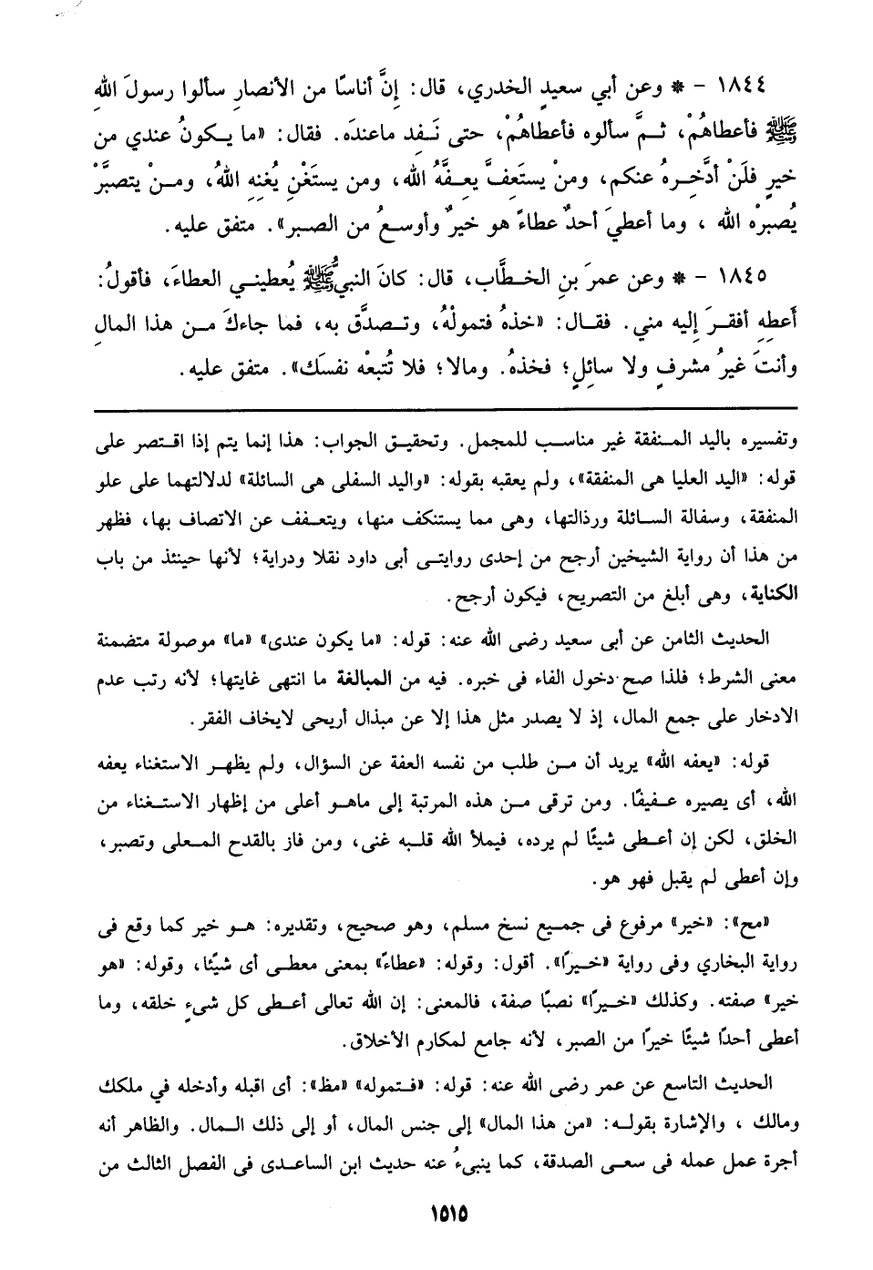 1844 - وعن أبي سعيد الخدري، قال: إِنَّ أناسًا من الأنصارِ سألوا رسول الله صلى الله عليه وسلم فأعطاهُمْ، ثم سألوه فأعطاهُمْ، حتى نَفد ماعندَه. فقال: ((ما يكونُ عندي من خيرٍ فلَنْ أدَّخِرهُ عنكم، ومنْ يستَعِفَّ يعِفَّهُ الله، ومن يستَغْنِ يُغنِهِ اللهُ، ومنْ يتصبَّرْ يُصبره الله, وما أعطيَ أحدٌ عطاءً هو خيرٌ وأوسعُ من الصبر)). متفق عليه.