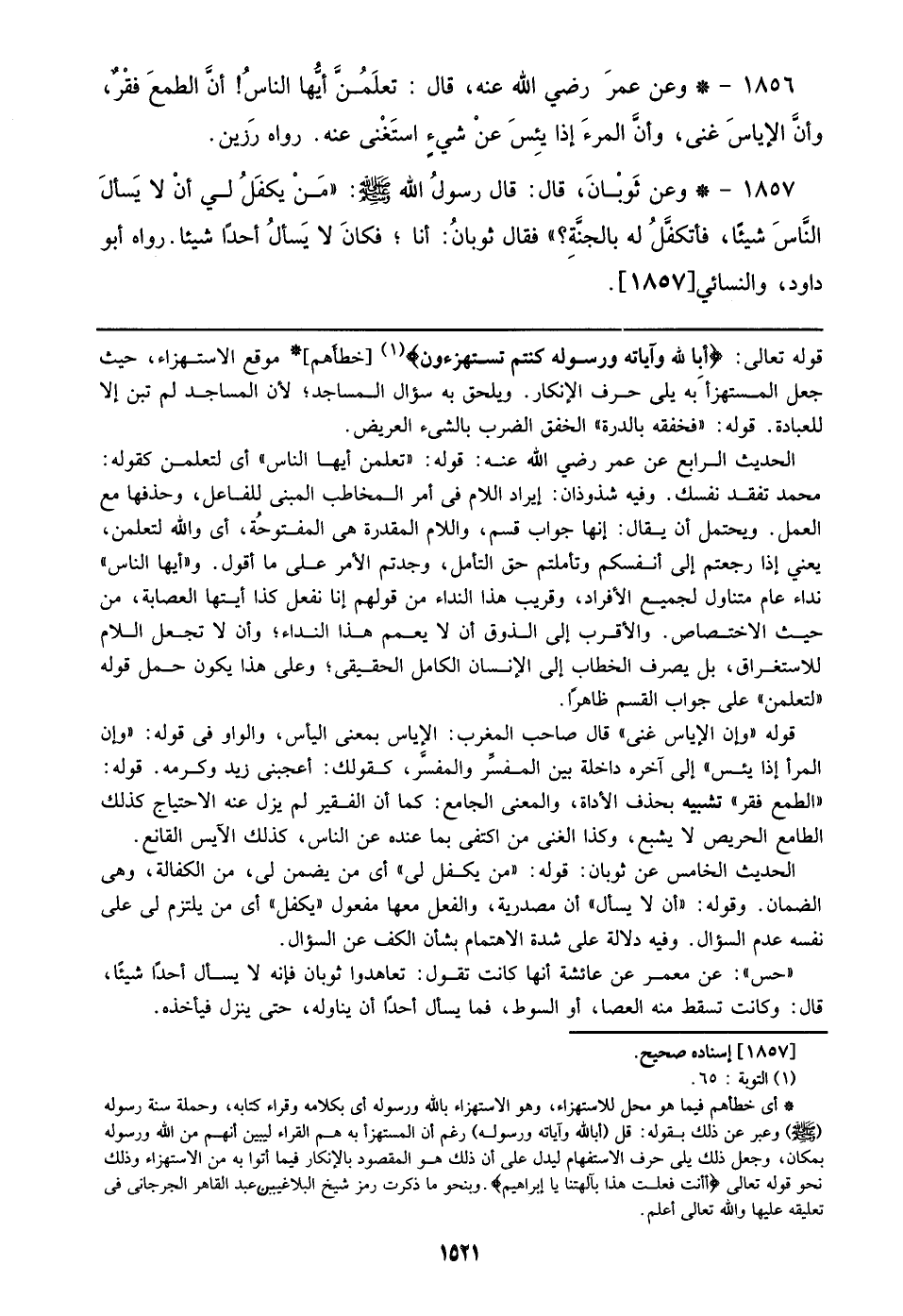 1857 - وعن ثَوبْانَ، قال: قال رسول الله صلى الله عليه وسلم: ((مَنْ يكفَلُ لي أنْ لا يَسألَ النَّاسَ شيئًا، فأتكفَّلُ له بالجنَّةِ؟)) فقال ثوبانُ: أنا؛ فكانَ لا يَسألُ أحدًا شيئا. رواه أبو داود، والنسائي [1857].
