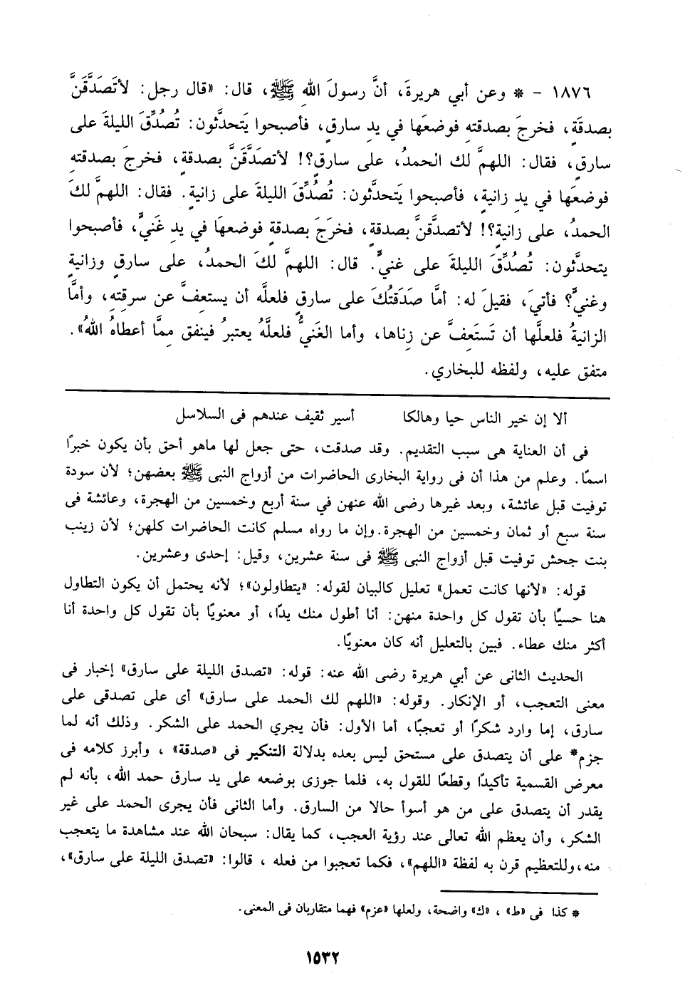 1876 - وعن أبي هريرةَ، أنَّ رسولَ اللهِ صلى الله عليه وسلم، قال: ((قال رجل: لأتَصدَّقنَّ بصدقَةٍ، فخرجَ بصدقتهِ فوضعَها في يدِ سارقٍ، فأصبحوا يَتحدَّثون: تُصُدِّقَ الليلةَ علي سارقٍ، فقال: اللهمَّ لك الحمدُ، علي سارقٍ؟! لأتصَدَّقنَّ بصدقةٍ، فخرجَ بصدقتهِ فوضعَها في يدِ زإنيةٍ، فأصبحوا يَتحدَّثون: تُصُدِّقَ الليلةَ علي زإنيةٍ. فقال: اللهمَّ لكَ الحمدُ، علي زإنيةٍ؟! لأتَصدَّقنَّ بصدقةٍ، فخرجَ بصدقةٍ فوضعهًا في يدِ غَنيٍّ، فأصبحوا يتحدثون: تُصُدِّقَ الليلةَ علي غنيٍّ. قال: اللهمَّ لكَ الحمدُ، علي سارقٍ وزإنيةٍ وغنيٍّ؟ فأتيَ، فقيلَ له: أمَّا صَدَقتُكَ علي سارقٍ فلعلَّه أن يستعِفَّ عن سرقتهِ، وأمَّا الزإنيةُ فلعلَّها أن تَستَعِفَّ عن زِناها، وأما الغَنيُّ فلعلَّهُ يعتبرُ فينفق مِمَّا أعطاهُ اللهُ)) متفق عليه، ولفظه للبخاري.