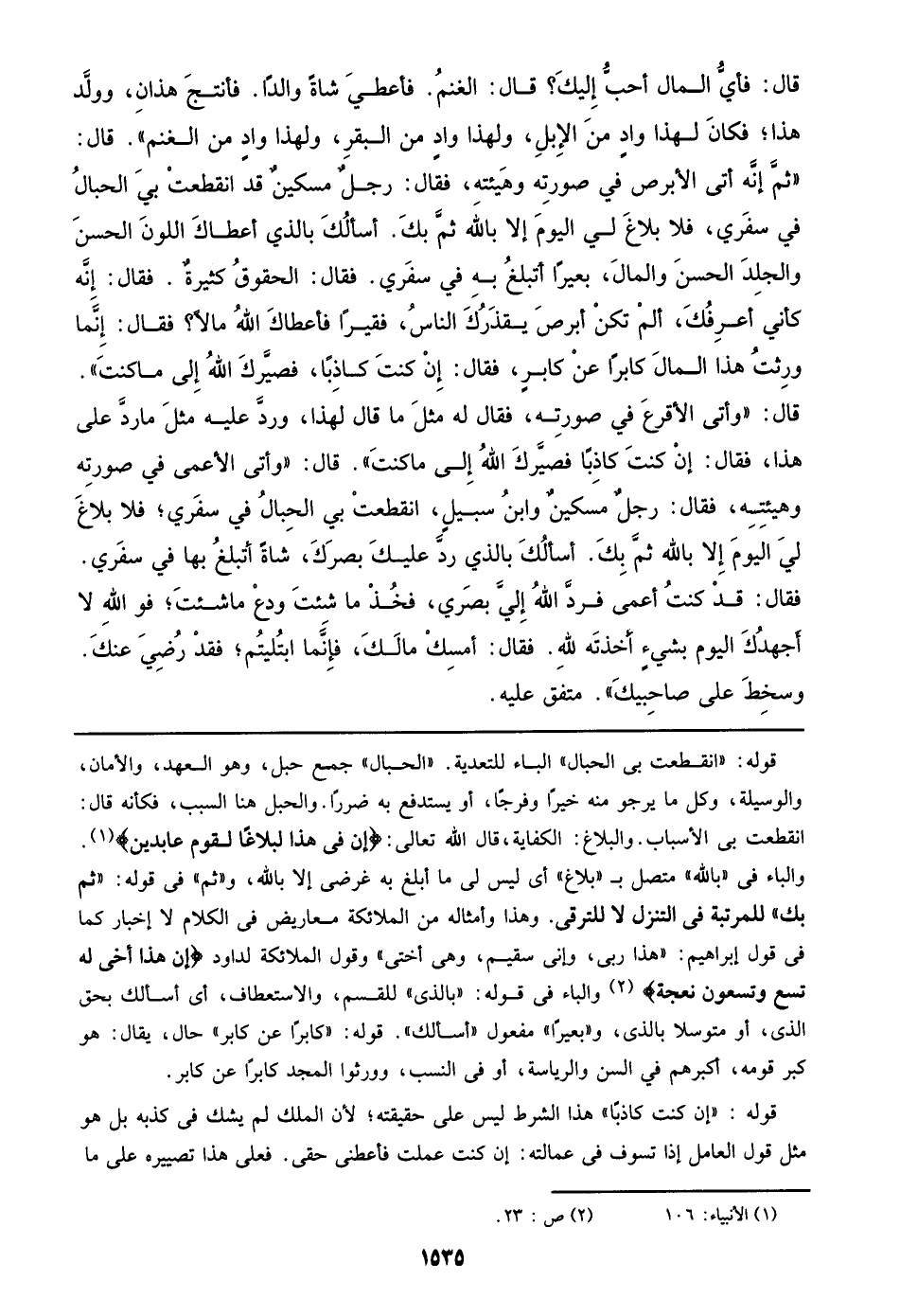 قال: فأيُّ المال أحبُّ إِليكَ؟ قال: الغنمُ. فأعطيَ شاةً والدًا. فأنتجَ هذانِ، وولَّد هذا؛ فكانَ لهذا وادٍ من الإِبلِ، ولهذا وادٍ من البقر، ولهذا واد من الغنم)). قال: ((ثمَّ إنَّه أتى الأبرص في صورته وهَيئتهِ، فقال: رجلٌ مسكينٌ قد انقطعتْ بيَ الحبالُ في سفَري، فلا بلاغَ لي اليومَ إلا بالله ثمَّ بكَ. أسألُكَ بالذي أعطاكَ اللونَ الحسنَ والجلدَ الحسنَ والمالَ، بعيرًا أتبلغُ بهِ ني سفَري. فقال: الحقوقُ كثيرةٌ. فقال: إنَّه كإني أعرِفُكَ، ألم تكنْ أبرصَ يقذَرُكَ الناسُ، فقيرًا فأعطاكَ الله مالاً؟ فقال: إنَّما ورِثتُ هذا المالَ كابرًا عن كابرٍ، فقال: إِنْ كنتَ كاذِبًا، فصيَّركَ اللهُ إلي ما كنتَ)). قال: ((وأتى الأقرعَ في صورته، فقال له مثلَ ما قال لهذا، وردَّ عليه مثلَ ماردَّ علي هذا، فقال: إنْ كنتَ كاذِبًا فصيَّركَ الله إلي ماكنتَ)). قال: ((وأتى الأعمى في صورته وهيئِتِه، فقال: رجلٌ مسكينٌ وابنُ سبيلٍ، انقطعت بي الحِبالُ في سفَري، فلا بلاغَ ليَ اليومَ إلا بالله ثمَّ بكَ. أسألُكَ بالذي ردَّ عليكَ بصركَ، شاةٌ أتبلغُ بها ني سفري. فقال: قد ْكنتُ أعمى فردَّ اللهُ إِليَّ بصري، فخُذْ ما شئتَ ودعْ ماشئتَ؛ فو الله لا أجهدُكَ اليوم بشيءٍ أخذتَه لله. فقال: أمسِكْ مالَكَ، فإِنَّما ابتُليتُم؛ فقدْ رُضِيَ عنكَ. وسخِطَ علي صاحِبيكَ)). متفق عليه.