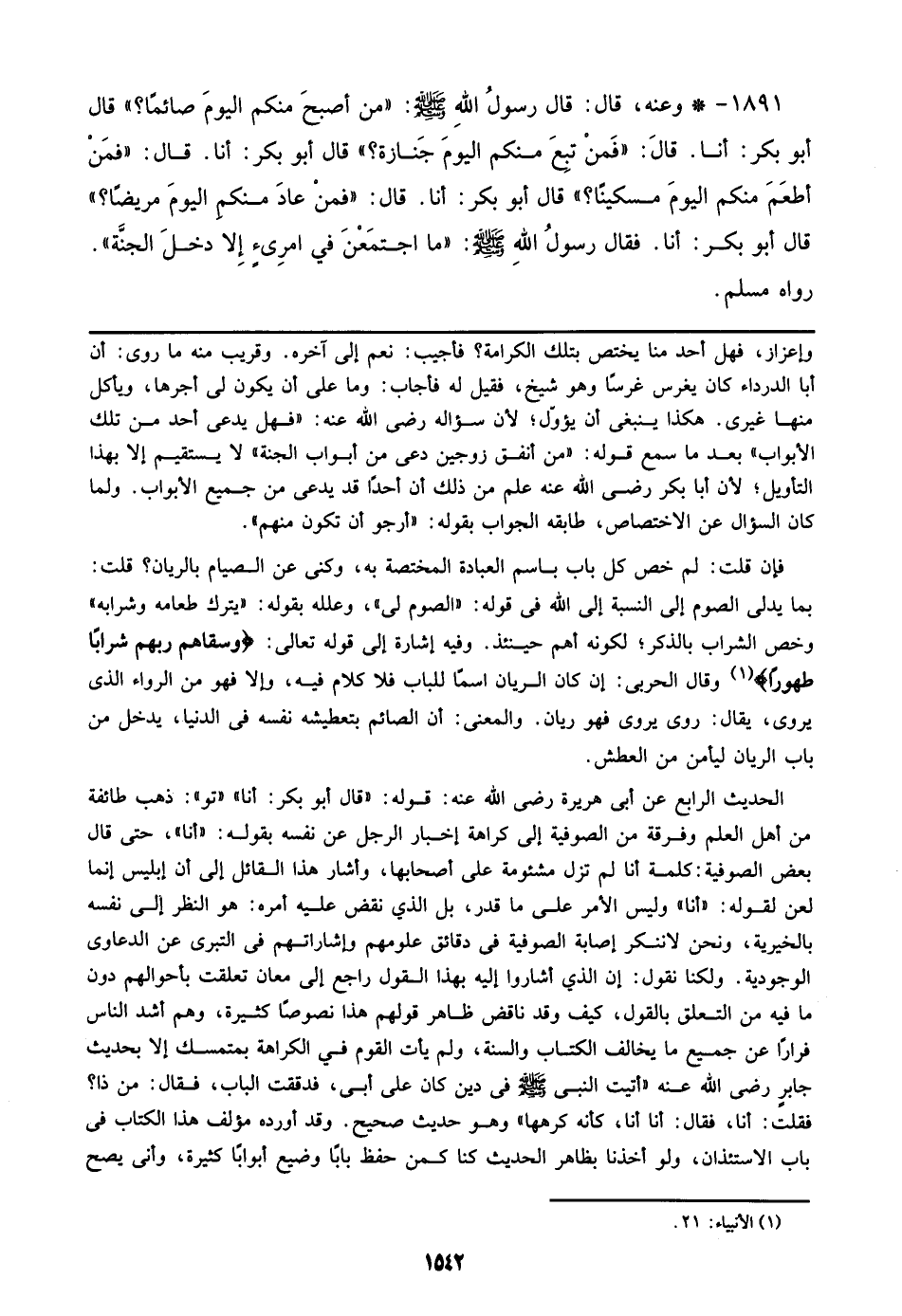 الحديث الرابع عن أبي هريرة رضي الله عنه: قوله: ((قال أبو بكر: أنا)) ((تو)): ذهب طائفة من أهل العلم وفرقة من الصوفية إلي كراهة إخبار الرجل عن نفسه بقوله: ((أنا))، حتى قال بعض الصوفية: كلمة أنا لم تزل مشيءومة علي أصحابها، وأشار هذا القائل إلي أن إبليس إنما لعن لقوله: ((أنا)) وليس الأمر علي ما قدر، بل الذي نقض عليه أمره: هو النظر إلي نفسه بالخيرية، ونحن لاننكر إصابة الصوفية في دقائق علومهم وإشاراتهم في التبرى عن الدعاوى الوجودية. ولكنا نقول: إن الذي أشاروا إليه بهذا القول راجع إلي معان تعلقت بأحوالهم دون ما فيه من التعلق بالقول، كيف وقد ناقض ظاهر قولهم هذا نصوصًا كثيرة، وهم أشد الناس فرارًا عن جميع ما يخالف الكتاب والسنة، ولم يأت القوم في الكرامة بمتمسك إلا بحديث جابر رضي الله عنه ((أتيت النبي صلى الله عليه وسلم في دين كان علي أبي، فدققت الباب، فقال: من ذا؟ فقلت: أنا، فقال: أنا أنا، كأنه كرهها)) وهو حديث صحيح. وقد أورده مؤلفه هذا الكتاب في باب الاستئذان، ولو أخذنا بظاهر الحديث كنا كمن حفظ بابًا وضيع أبوابًا كثيرة، وأنى يصح
