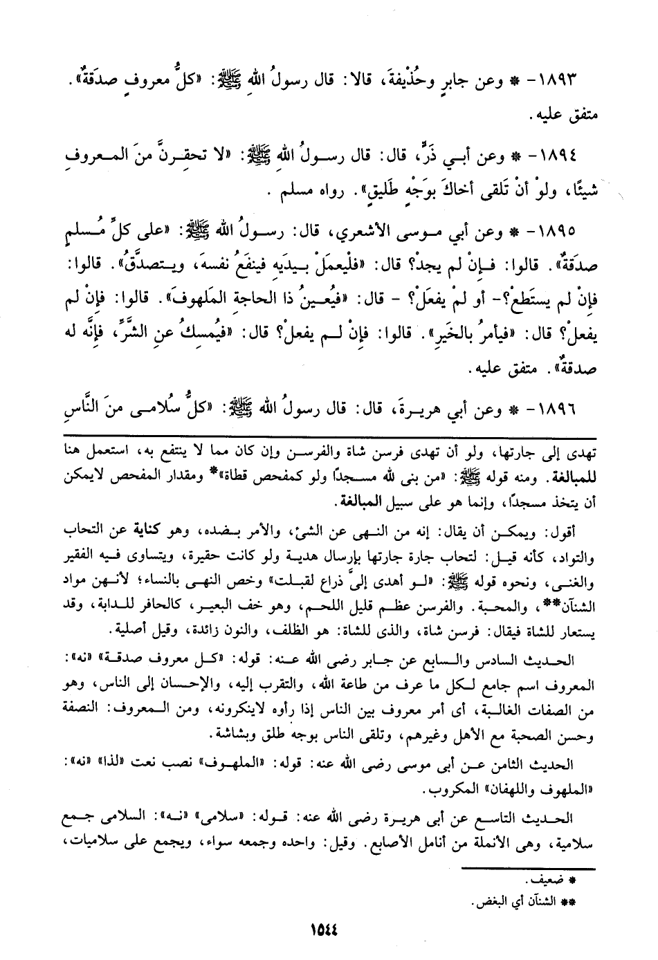 الحديث السادس والسابع عن جابر رضي الله عنه: قوله: ((كل معروف صدقة)) ((نه)): المعروف اسم جامع لكل ما عرف من طاعة الله، والتقرب إليه، والإحسان إلي الناس، وهو من الصفات الغالبة، أي أمر معروف بين الناس إذا رأوه لاينكرونه، ومن المعروف: النصفة وحسن الصحبة مع الأهل وغيرهم، وتلقى الناس بوجه طلق وبشاشة.