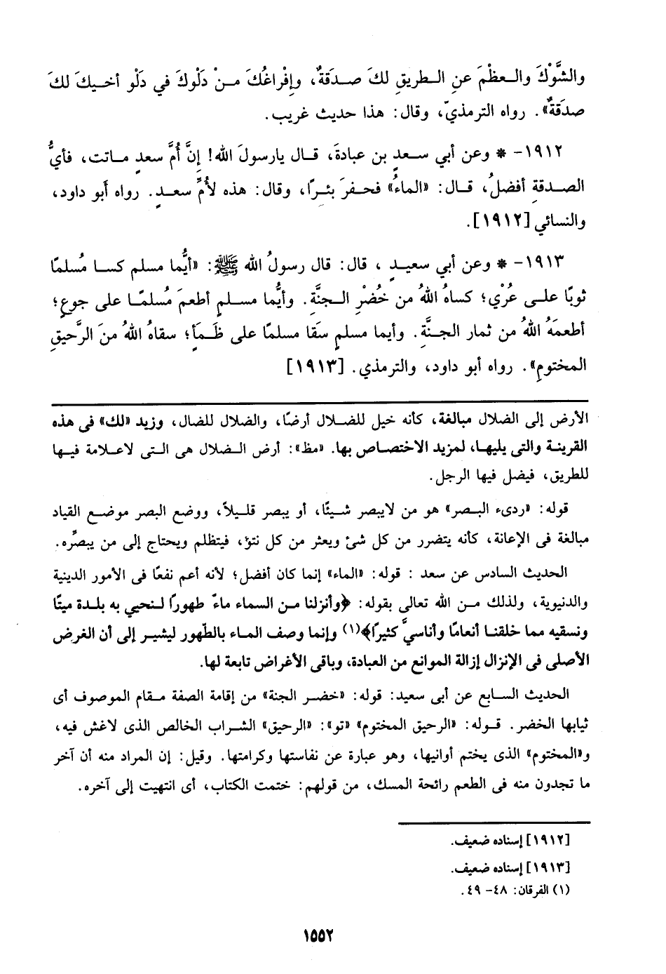 الحديث السادس عن سعد: قوله: ((الماء)) إنما كان أفضل؛ لأنه أعم نفعاً في الأمور الدينية والدنيوية، ولذلك من الله تعالي بقوله:} وأنزلنا من السماء ماءً طهوراً لنحيي به بلدة ميتاً ونسقيه مما خلقنا أنعاماً وأناسيَّ كثيراً {وإنما وصف الماء بالطهور ليشير إلي أن الغرض الأصلي في الإنزال إزالة الموانع من العبادة، وباقي الأغراض تابعة لها.