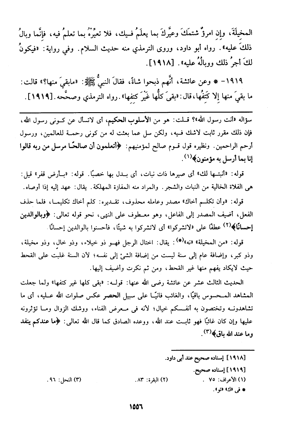 1919 - وعن عائشة، أنهم ذبحوا شاةً، فقالَ النبيُّ صلى الله عليه وسلم: ((ما بقي منها؟)) قالت: ما بقيَ منها إِلا كَتِفُها، قال: ((بقىَ كلُّها غَيْرَ كتِفِها)). رواه الترمذي وصحَّحه. [1919].