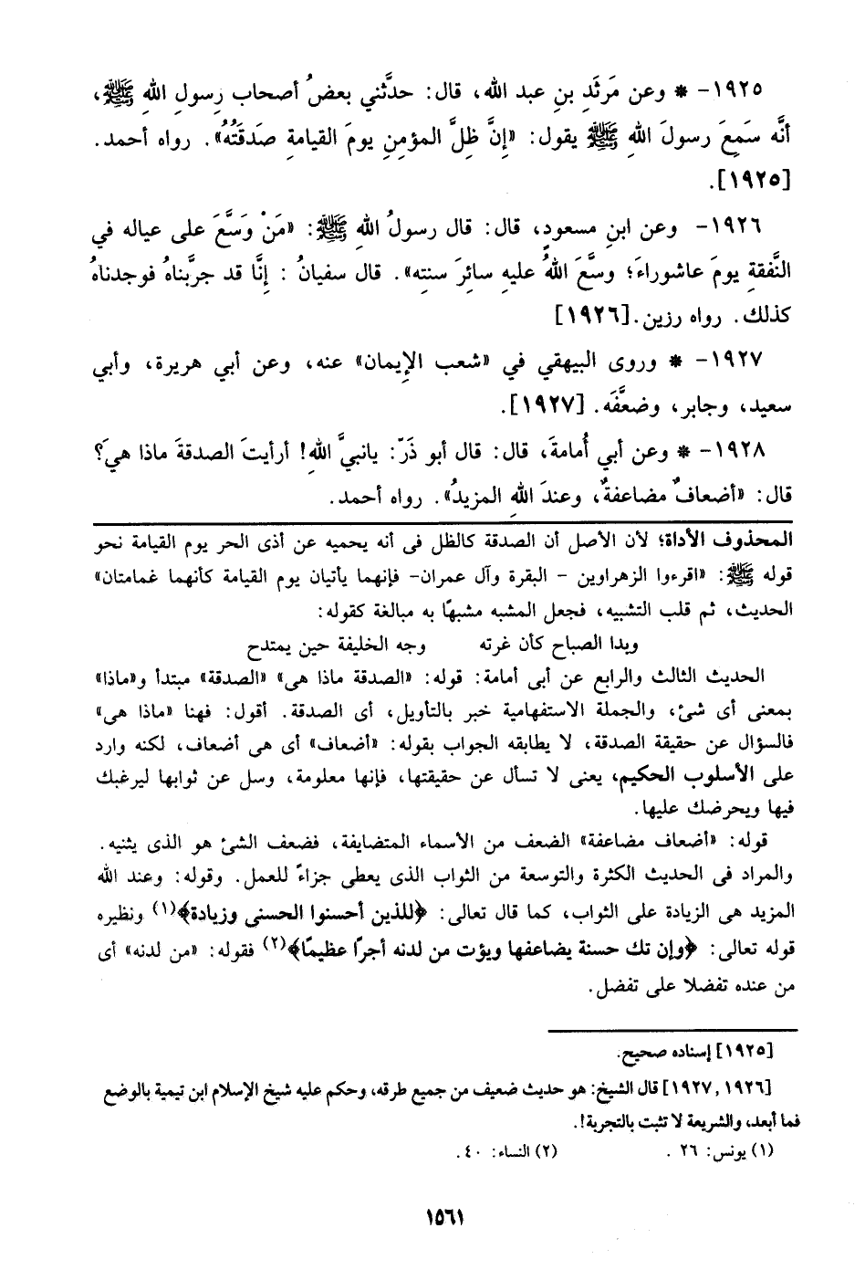 1925 - وعن مَرثَدِ بنِ عبد الله، قال: حدَّثني بعضُ أصحاب رسولِ اللهِ صلى الله عليه وسلم، أنهَّ سَمِعَ رسولَ اللهِ صلى الله عليه وسلم يقول: ((إِنَّ ظِلَّ المؤِمنِ يومَ القيامةِ صَدقَتُهُ)). رواه أحمد. [1925].