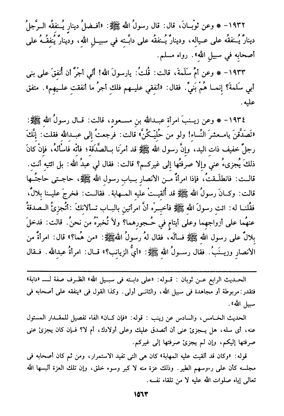 1934 - وعن زينبَ امرأةِ عبد الله بنِ مسعودٍ، قالت: قال رسولُ اللهِ صلى الله عليه وسلم: ((تَصَدَّقنَ يا معشرَ النِّساءِ! ولو من حُلِيّكُنَّ)) قالت: فرجعتُ إِلي عبدِ اللهِ فقلت: إِنَّكَ رجلٌ خفيف ذاتِ اليد، وإِنَّ رسول الله صلى الله عليه وسلم قد أمرَنا بالصَّدَقَةِ؛ فأْتِه فاسْألهُ، فإِنْ كانَ ذلكَ يُجزئُ عني وإِلا صرفتُها إِلي غيركم؟ قلت: فقال لي عبدُ الله: بل ائتيهِ أنتِ. قالت: فانطلَقتُ، فإذا امرأةٌ من الأنصارِ ببابِ رسولِ الله صلى الله عليه وسلم، حاجتي حاجتُها قالت: وكانَ رسولُ الله صلى الله عليه وسلم قد أُلقِيتْ عليهِ المهابة. فقالت: فخرجَ علينا بِلالٌ، فقُلنا له: ائتِ رسولَ اللهِ صلى الله عليه وسلم فأخبِرْه أنَّ امرأتينِ بالباب تسألانِكَ: أتُجزئُ الصدقةُ عنهُما علي أزواجهما وعلي أيتامٍ في حُجورِهما؟ ولاَ تُخبرْهُ من نحنُ. قالت: فدخلَ بِلالٌ علي رسول الله صلى الله عليه وسلم فسألَه، فقال لهُ رسولُ الله صلى الله عليه وسلم: ((من هُما؟)) قال: امرأةٌ من الأنصارِ وزينَبُ. فقال رسولُ اللهِ صلى الله عليه وسلم ((أي الزيانِب؟)) قال: امرأةُ عبدِ الله. فقال