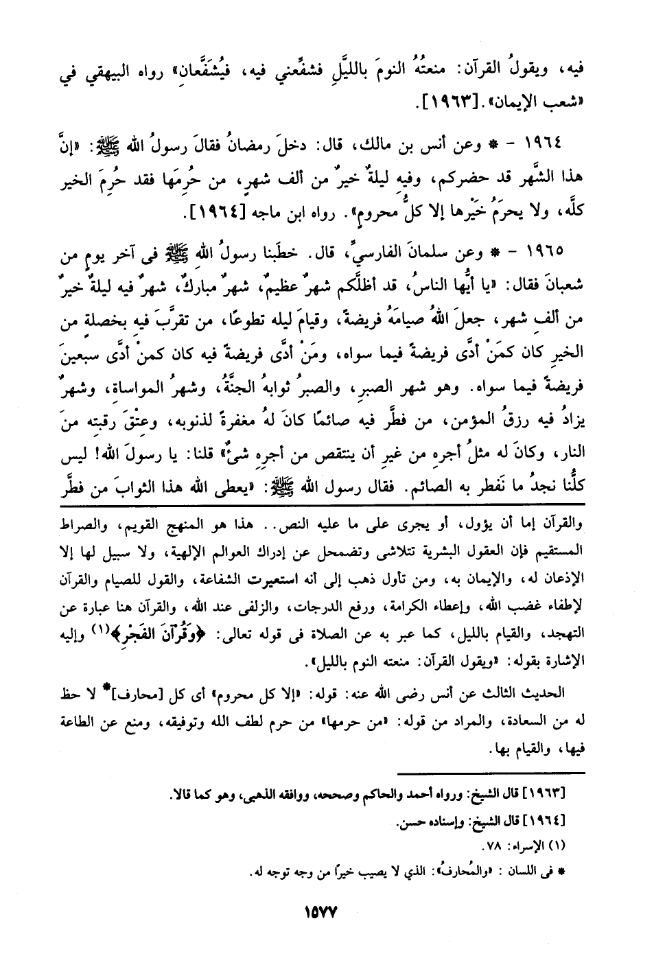 1965 - وعن سليمانَ الفارسيِّ، قال. خطَبنا رسولُ اللهِ صلى الله عليه وسلم في آخر يومٍ من شعبانَ فقال: ((يا أيُّها الناسُ، قد أظلَّكم شهرٌ عظيمٌ، شهرٌ مباركٌ، شهرٌ فيه ليلةٌ خيرٌ من ألفِ شهر، جعلَ اللهُ صيامَهُ فريضةً، وقيامَ ليله تطوعاً، من تقرَّبَ فيهِ بخصلةٍ من الخير كان كمَنْ أدَّى فريضةً فيما سواه، ومَنْ أدَّى فريضةً فيه كان كمنْ أدَّى سبعينَ فريضةً فيما سواه. وهو شهر الصبرِ، والصبرُ ثوابهُ الجنَّةُ، وشهرُ المواساةِ، وشهرٌ يزادُ فيه رزقُ المؤمن، من فطَّر فيه صائماً كانَ لهُ مغفرةً لذنوبه، وعَتْقَ رقبتِه منَ النار، وكانَ له مثلُ أجرهِ من غيرِ أن ينتقص من أجرِهِ شيءٌ)) قلنا: يا رسولَ الله! ليس كلُّنا نجدُ ما نَفطر به الصائم. فقال رسول الله صلى الله عليه وسلم: ((يعطى الله هذا الثوابَ من فطَّر