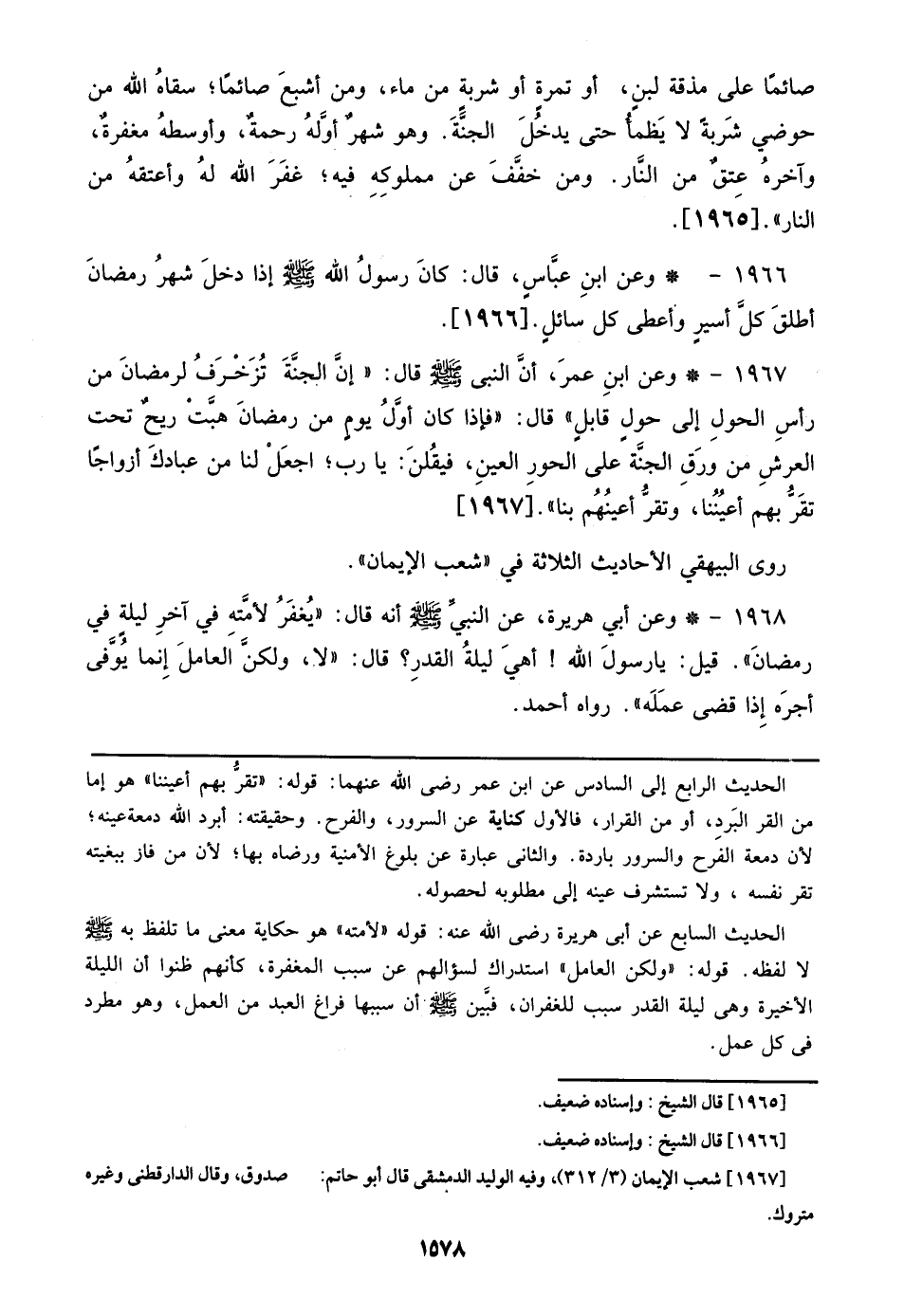 1968 - وعن أبي هريرة، عن النبيِّ صلى الله عليه وسلم أنه قال: ((يُغفَرُ لأمَّتهِ في آخرِ ليلة في رمضانَ)). قيل: يا رسولَ الله! أهيَ ليلةُ القدرِ؟ قال: ((لا، ولكنَّ العاملَ لإِنما يُوَّفي أجرَه إِذا قضى عمَلَه)). رواه أحمد.