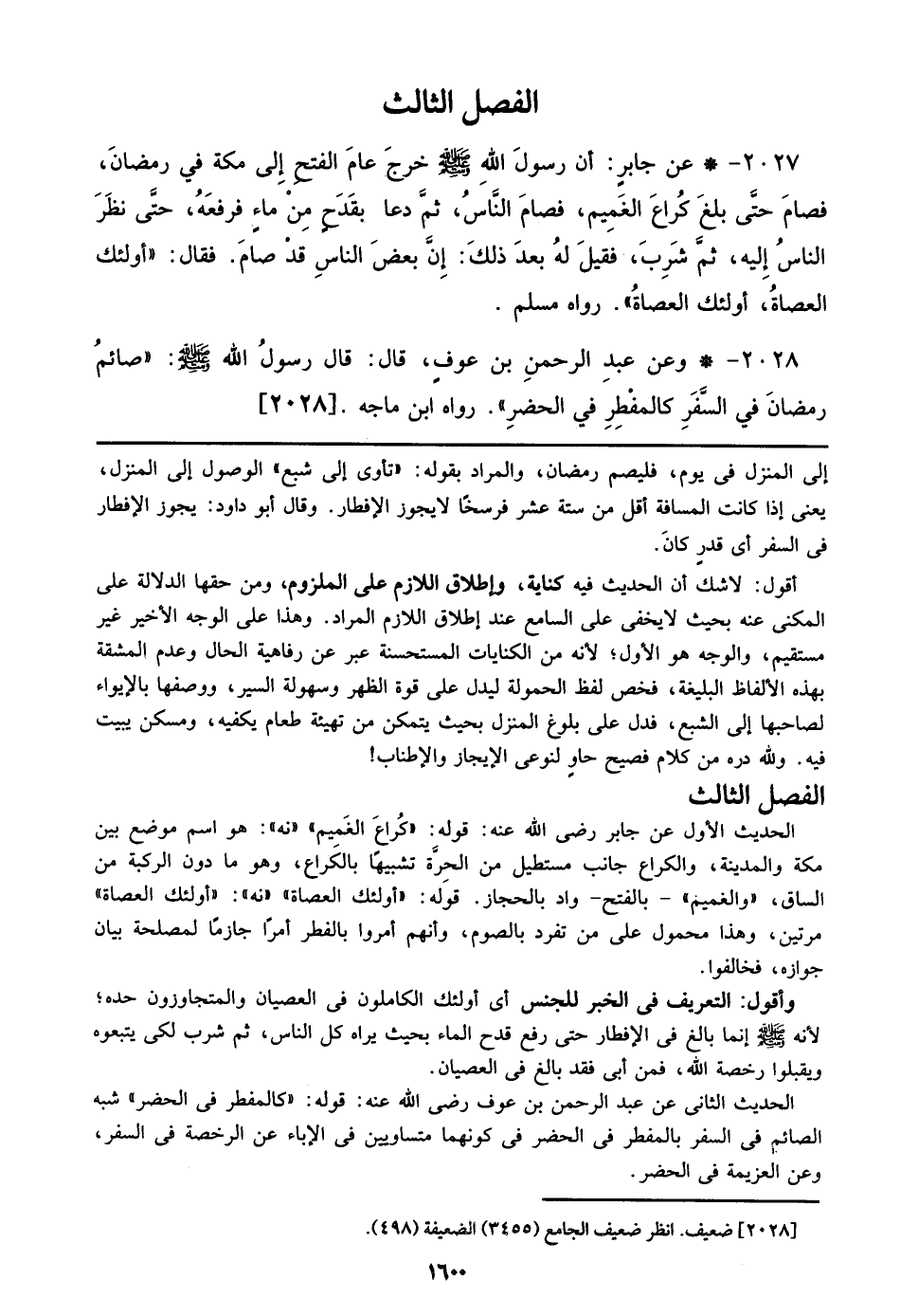 الحديث الأول عن جابر رضي الله عنه: قوله: ((كُراعَ الغَمِيم)) ((نه)): هو اسم موضع بين مكة والمدينة، والكراع جانب مستطيل من الحِرة تشبيهاً بالكراع، وهو ما دون الركبة من الساق، ((والغميم)) - بالفتح- واد بالحجاز. قوله: ((أولئك العصاة)) ((نه)): ((أولئك العصاة)) مرتين، وهذا محمول علي من تفرد بالصوم، وأنهم أمروا بالفطر أمراً جازماً لمصلحة بيان جوازه، فخالفوا.
