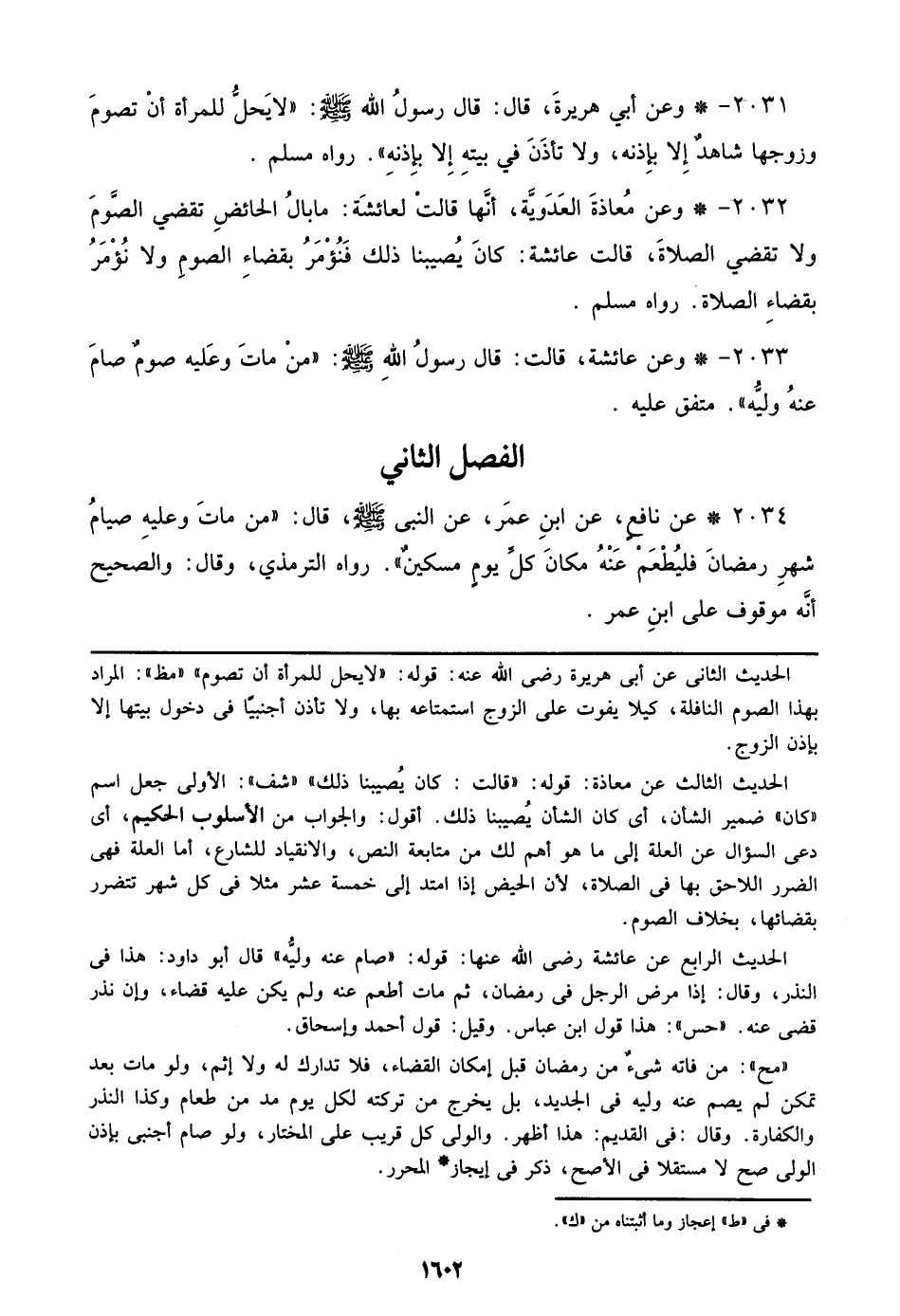 الحديث الثانى عن أبي هريرة رضي الله عنه: قوله: ((لا يحل للمرأة أن تصوم)) ((مظ)): المراد بهذا الصوم النافلة، كيلا يفوت علي الزوج استمتاعه بها، ولا تأذن أجنبيًا في دخول بيتها _لا بيا ذن الزوج.