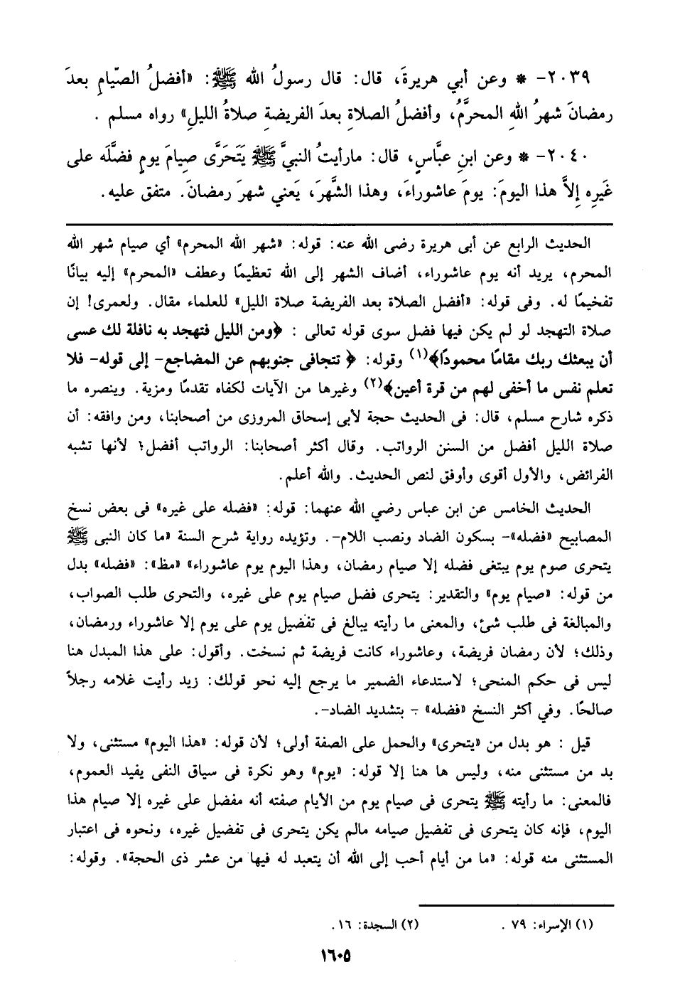 الحديث الرابع عن أبي هريرة رضي الله عنه: قوله: ((شهر الله المحرم)) أي صيام شهر الله المحرم، يريد أنه يوم عاشوراء، أضاف الشهر إلي الله تعظيمًا وعطف ((المحرم)) إليه بيانًا تفخيمًا له. وفي قوله: ((أفضل الصلاة بعد الفريضة صلاة الليل)) للعلماء مقال. ولعمرى! إن صلاة التهجد لو لم يكن فيها فضل سوى قوله تعالي: {ومن الليل فتهجد به نافلة لك عسى أن يبعثك ربك مقامًا محمودًا} وقوله: {تتجافي جنوبهم عن المضاجع - إلي قوله - فلا تعلم نفس ما أخفي لهم من قرة أعين} وغيرها من الآيات لكفاه تقدمًا ومزية. وينصره ما ذكره شارح مسلم، قال: في الحديث حجة لأبي إسحاق المروزى من أصحابنا، ومن وافقه: أن صلاة الليل أفضل من السنن الرواتب. وقال أكثر أصحابنا: الرواتب أفضل؛ لأنها تشبه الفرائض، والأول أقوى وأوفق لنص الحديث. والله أعلم.