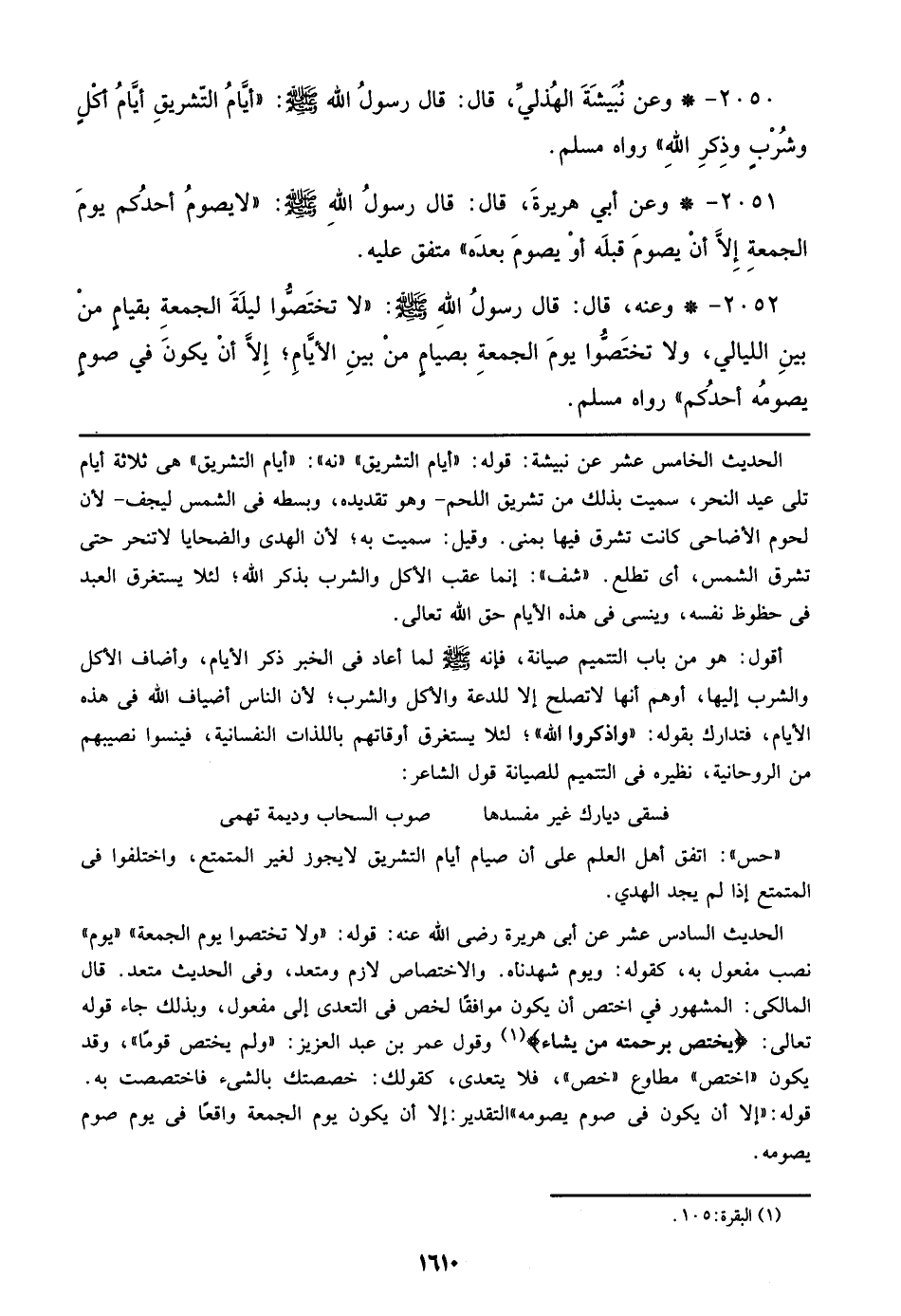 الحديث السادس عشر عن أبي هريرة رضي الله عنه: قوله: ((ولا تختصوا يوم الجمعة)) ((يوم)) نصب مفعول به، كقوله: ويوم شهدناه. والاختصاص لازم ومتعد، وفي الحديث متعد. قال المالكى: المشهور في اختص أن يكون موافقًا لخص في التعدى إلي مفعول، وبذلك جاء قوله تعالي: {يختص برحمته من يشاء} وقول عمر بن عبد العزيز: ((ولم يختص قومًا))، وقد يكون ((اختص)) مطاوع ((خص))، فلا يتعدى، كقولك: خصصتك بالشىء فاختصصت به. قوله: ((إلا أن يكون في صوم يصومه)) التقدير: إلا أن يكون يوم الجمعة واقعًا في يوم صوم يصومه.