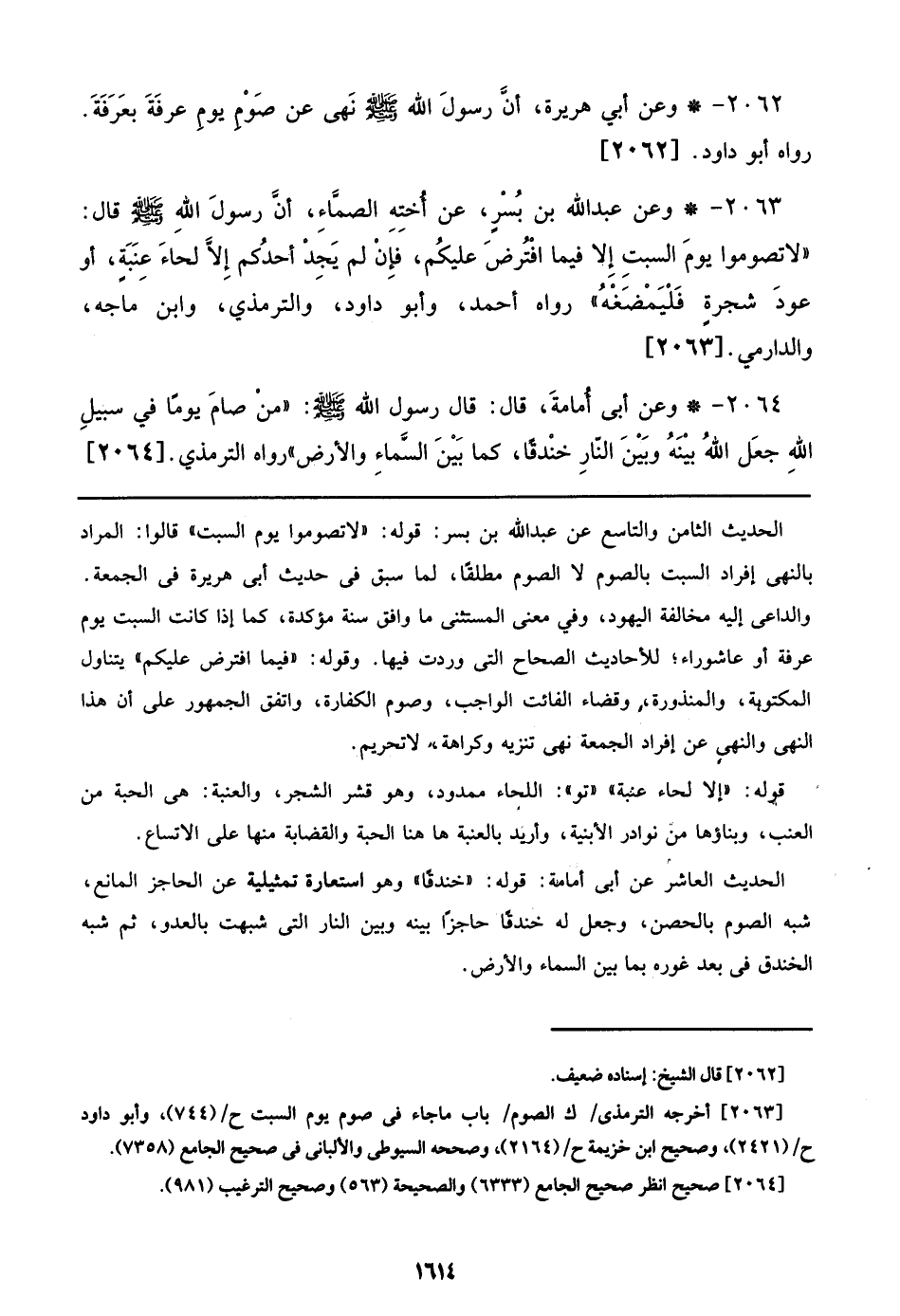 2063 - وعن عبد الله بن بُسْرٍ، عن أُختِهِ الصمَّاءِ، أنَّ رسولَ الله صلى الله عليه وسلم قال: ((لا تصوموا يومَ السبتِ إلا فيما افتُرضَ عليكُم، فإِنْ لم يجِد أحدُكم إِلاَّ لحاءَ عِنَبَةٍ، أو عودَ شجرةٍ فليمضغهُ)) رواه أحمد، وأبو داود، والترمذي، وابن ماجه، والدارمي. [2063]