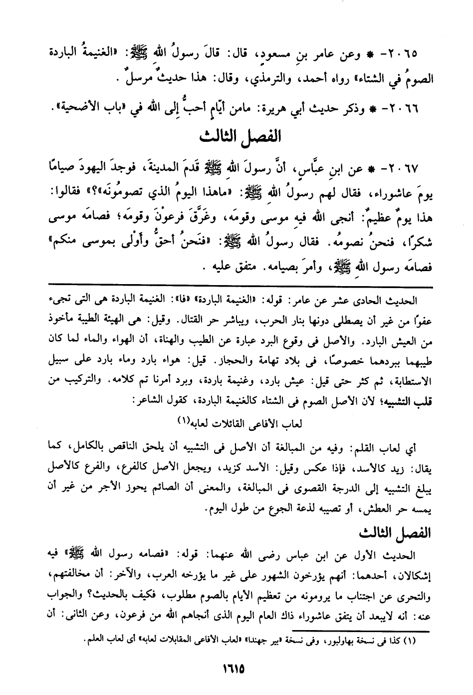 الحديث الحادى عشر عن عامر: قوله: ((الغنيمة الباردة)) ((فا)): الغنيمة الباردة هي التي تجىء عفوًا من غير أن يصطلي دونها بنار الحرب، ويباشر حر القتال. وقيل: هي الهيئة الطيبة مأخوذ من العيش البارد. والأصل في وقوع البرد عبارة عن الطيب والهناة، أن الهواء والماء لما كان طيبهما ببردهما خصوصًا، في بلاد تهامة والحجاز. قيل: هواء بارد وماء بارد علي سبيل الاستطابة، ثم كثر حتى قيل: عيش بارد، وغنيمة باردة، وبرد أمرنا تم كلامه. والتركيب من قلب التشبيه؛ لأن الأصل الصوم في الشتاء كالغنيمة الباردة، كقول الشاعر:
