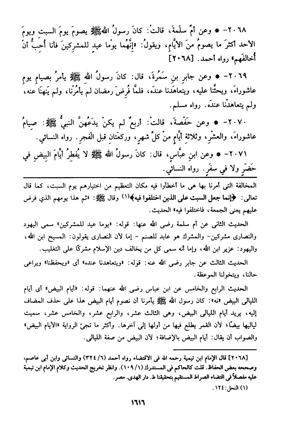 2071 - وعن ابن عباسٍ، قال: كان رسولُ الله صلى الله عليه وسلم لا يُفطِرُ أيَّامَ البيضِ في حَضَرٍ ولا في سفَرٍ. رواه النسائي.